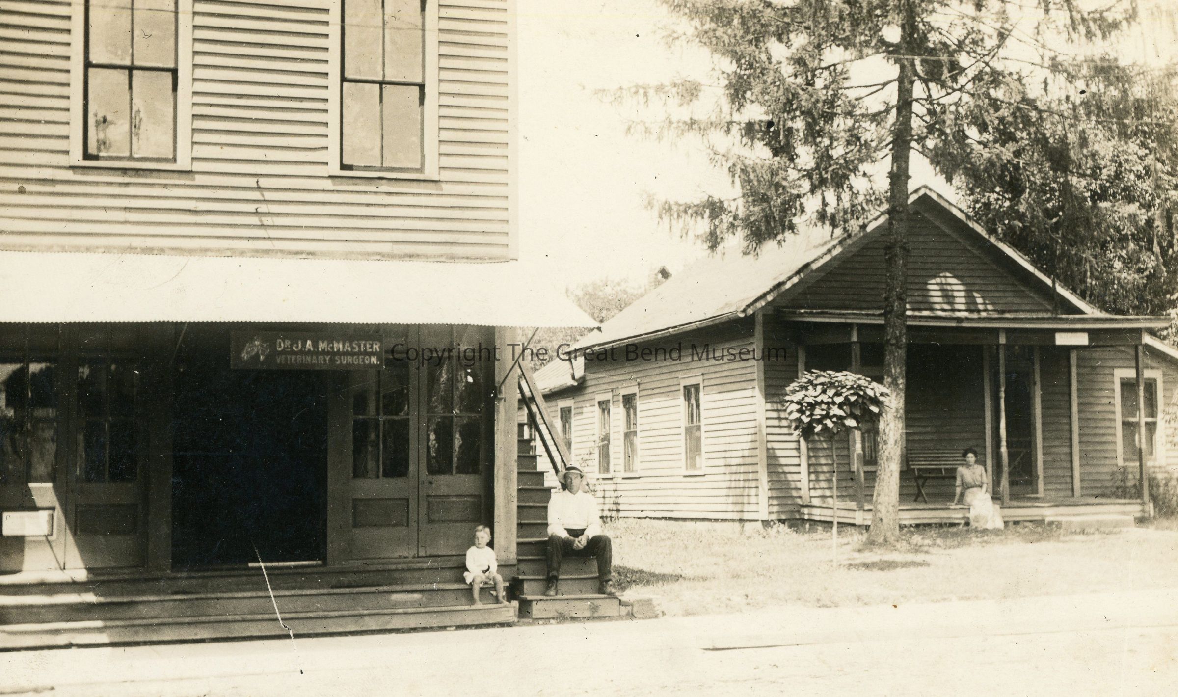 The veterinarian office in ravenswood was located at 409 sand st. this picture was taken in 1912. from left to right are william j mmaster, dr. ja mcmaster, and mrs ja mcmaster. Before 1912 this building was a meat market owned by tom compston, with the citizens telephone service upstairs. Courtesy museum 45Acquisition