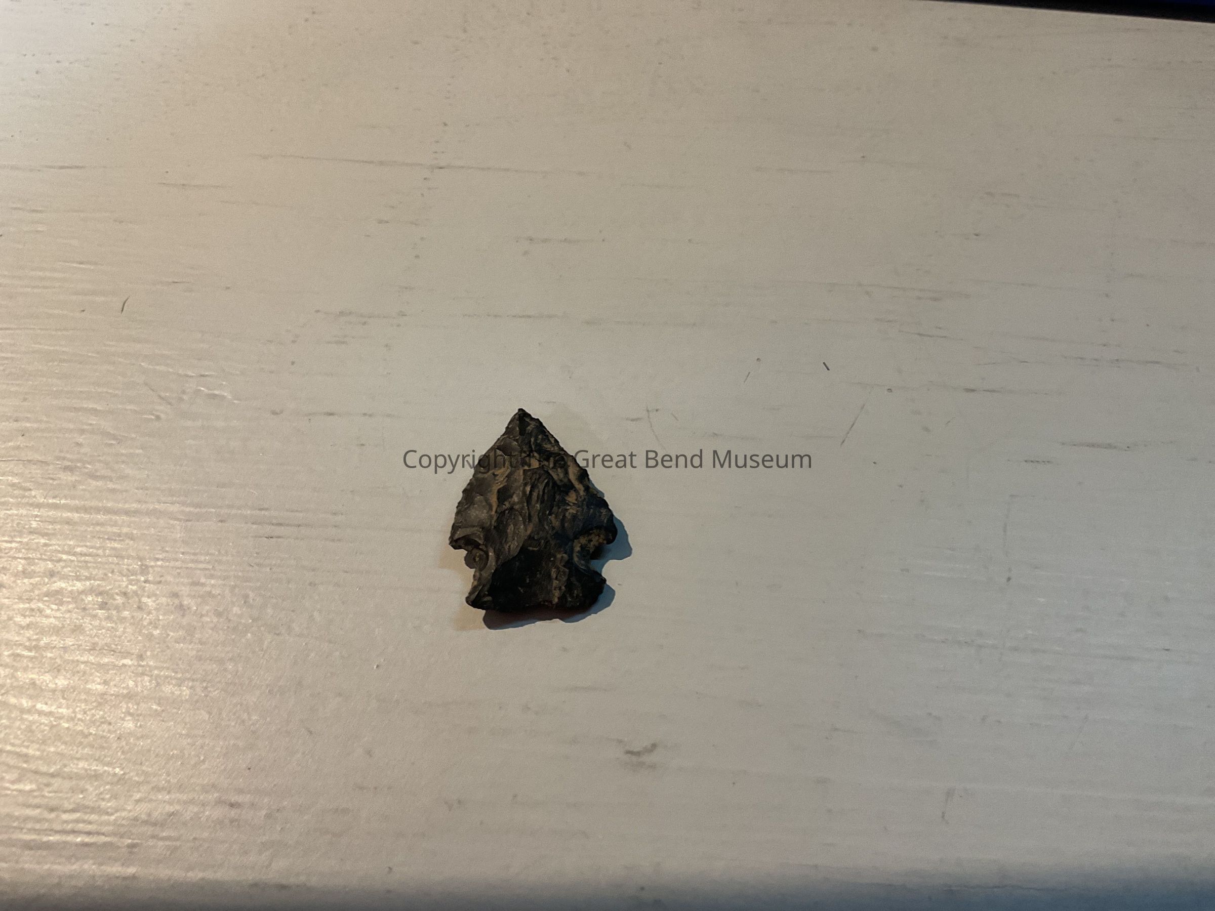 Flint is Dark Gray with some light Brown mixed in. Triangular shaped blade with barbed shoulders, and side notched. Corner notches are narrow. Blade is flat in the middle.Acquisition