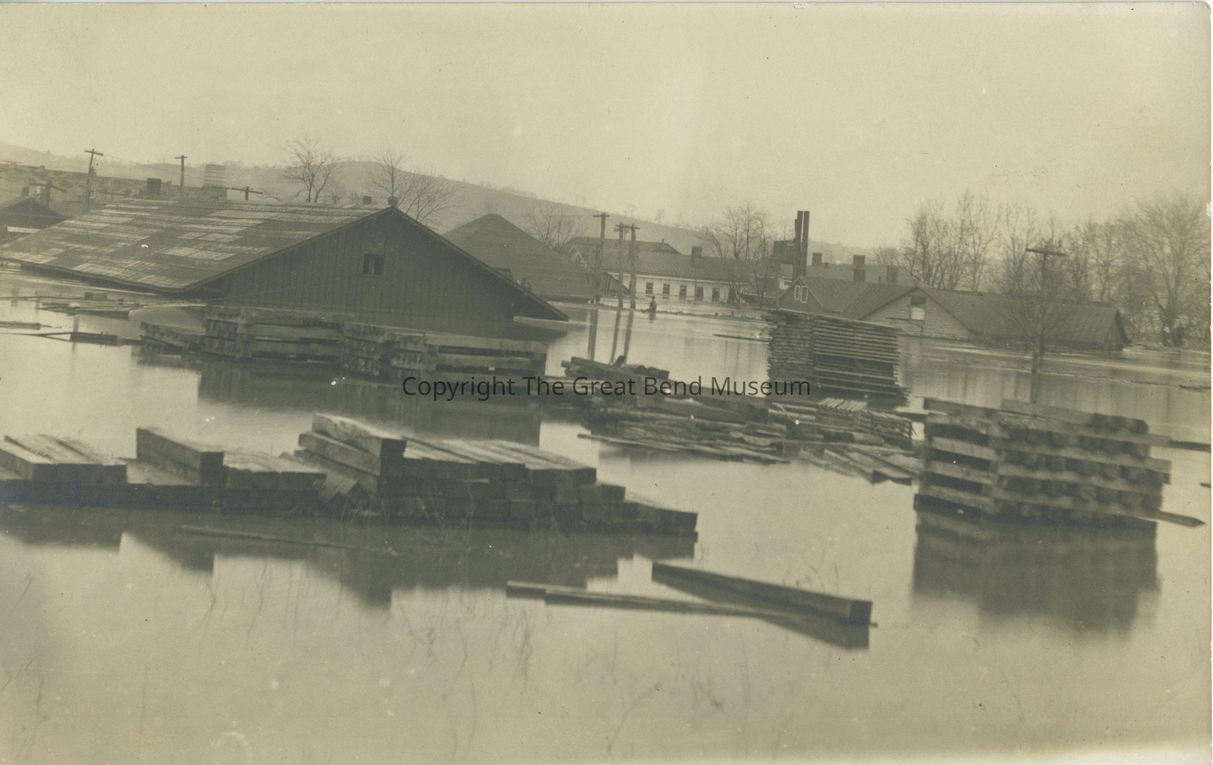 Image of floodwaters above lumber stacks, buildings almost submerged beyond. Building in center left is cargo depot, with stacks of lumber, pallets, and other loads floating nearby. Ravenswood House windows (upper level) visible in center distance. Possible boat (with smokestacks) passing it, prow just visible.Acquisition