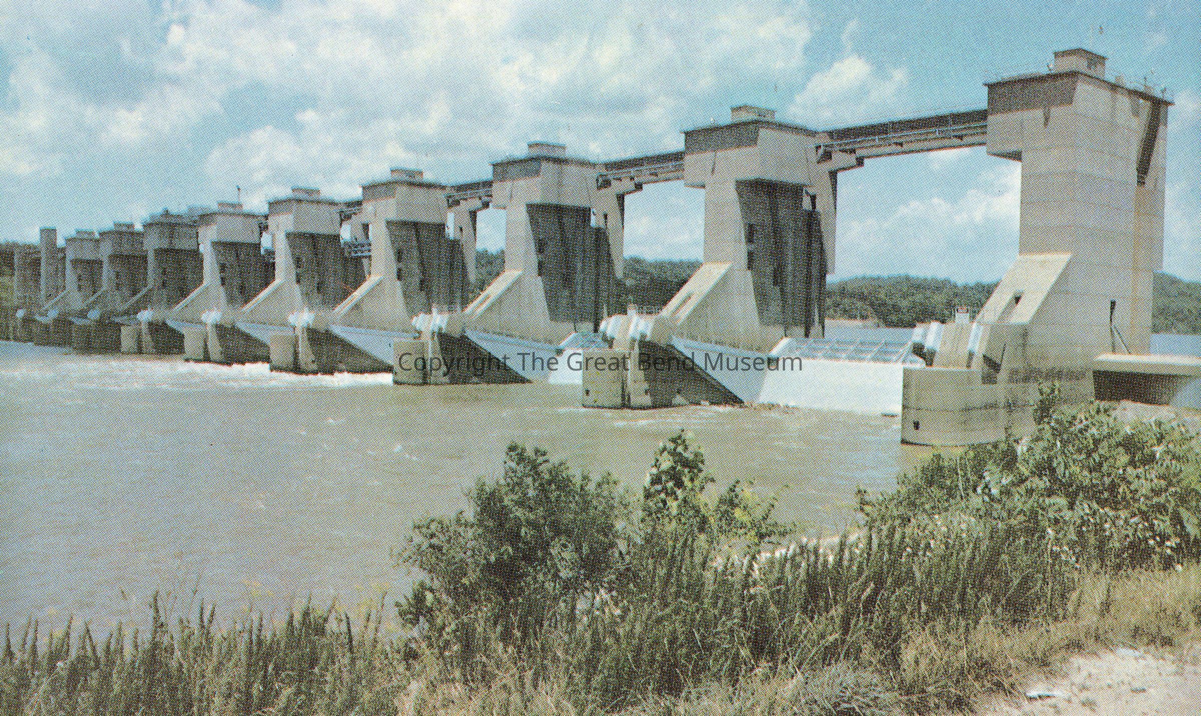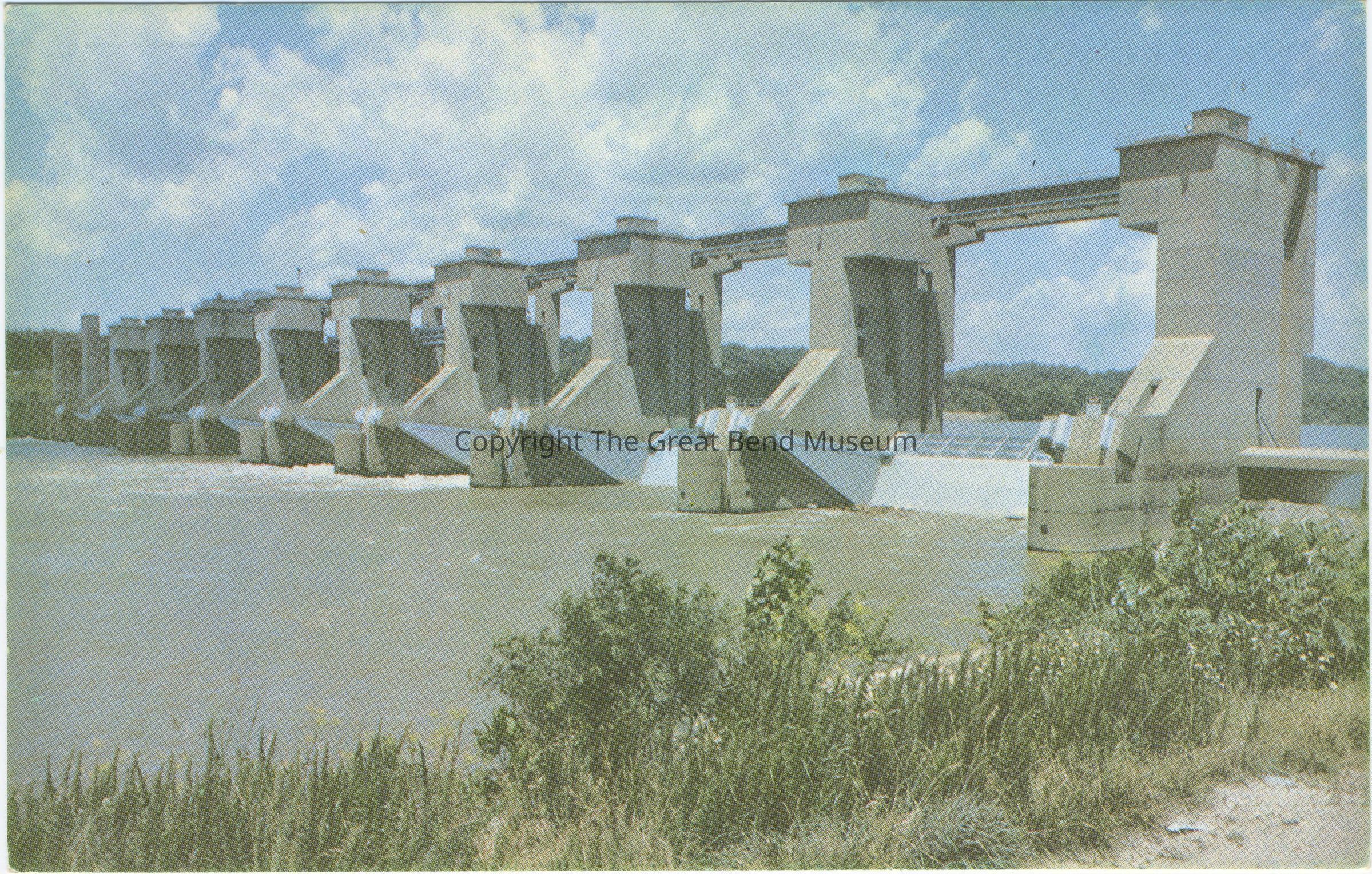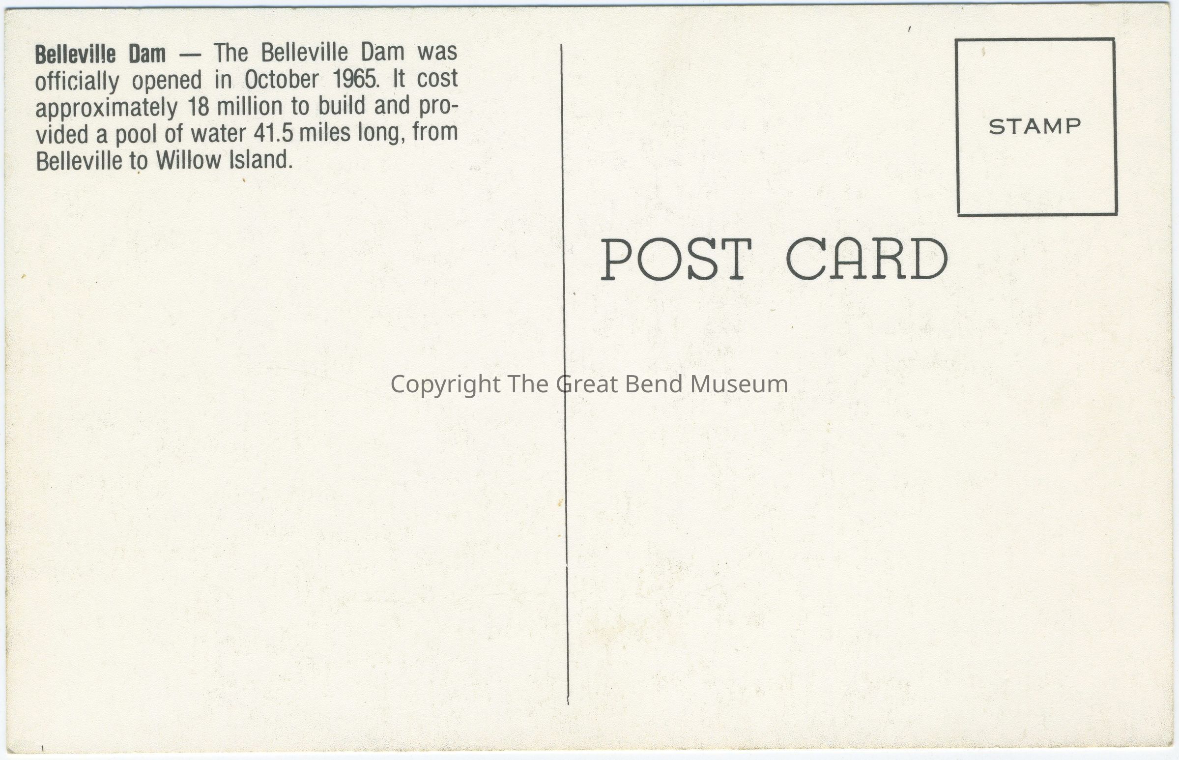 Color Postcard - Belleville Dam - blue skies, fluffy clouds - sunny day. Back: "Belleville Dam - The Belleville Dam was officially opened in October 1965. It cost approximately $18 million to build and provided a pool of water 41.5 miles long, from Belleville to Willow Island. Unused postcard with place for stamp.