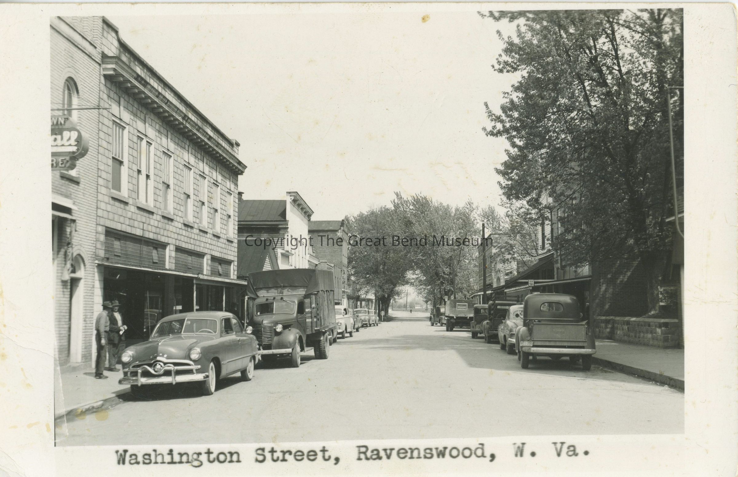 B/W photo postcard - Washington Street, Ravenswood, WV, Rexall Drug Store sign and 2 men on sidewalk (left) cars parked both sides of street - photo facing north from in street. "about 1950" on back