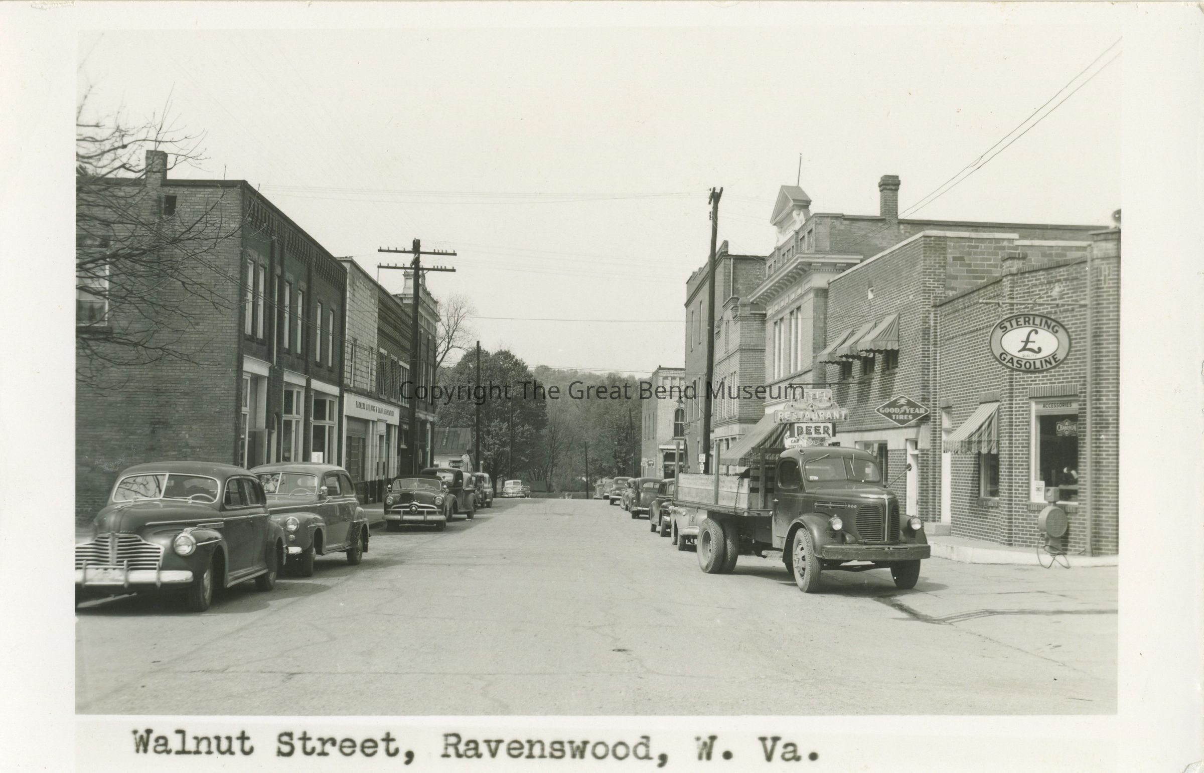 B/W Picture postcard - white border. "Walnut Street, Ravenswood, W. Va." -- cars parked on both sides of street. Photo taken facing river. (Walnut and Virginia Streets) Sterling Gasoline, Goodyear Tires on right side -- delivery truck. Taken facing Washington Street intersection ]. Unused postcard. Kodak paper -- Place Stamp here -- Title of photo typewriter type front -- Bottom edge in border