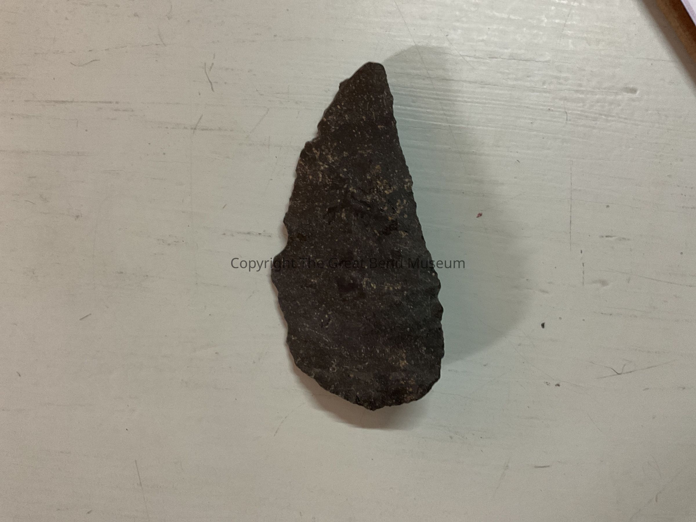 Long leaf shaped blade, greatest width is near the middle of the blade. Top of blade is curved. Base is rounded Curved side of blade is beveledAcquisition