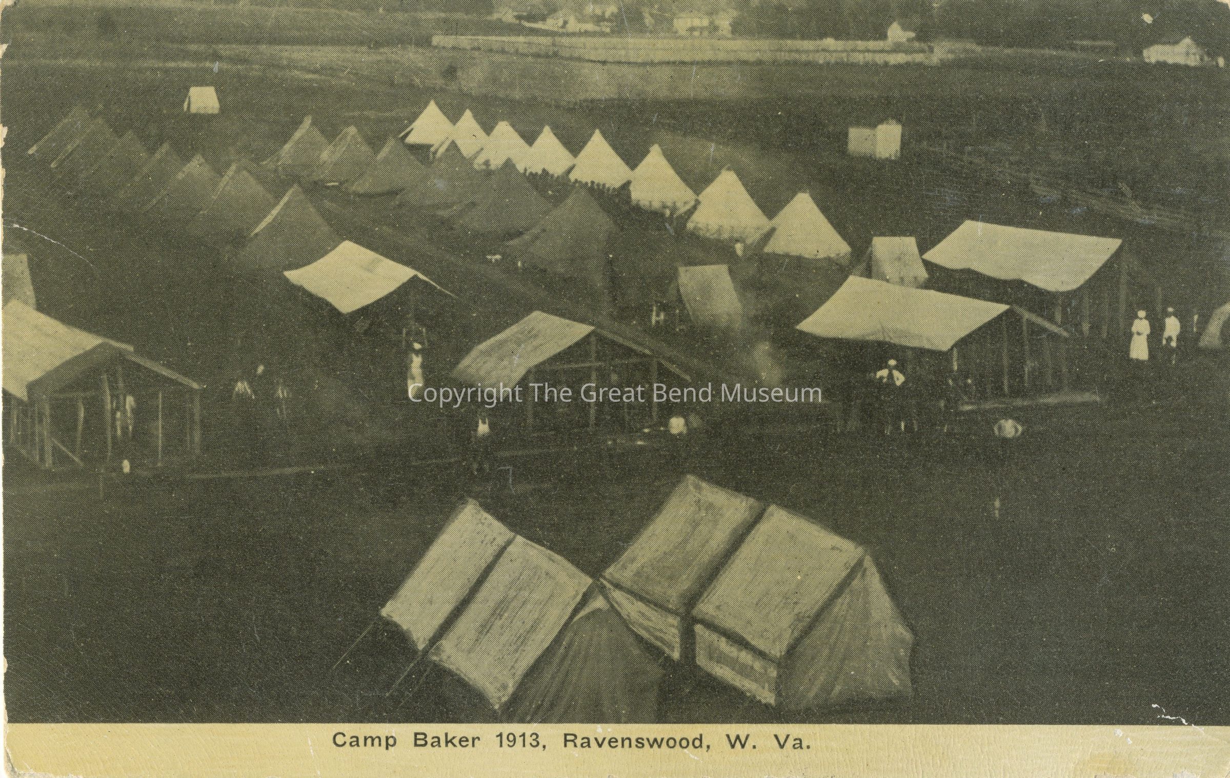 Postcard with photo of tents in field, including approximately 21 teepees. Title typed at bottom on back - "Jackson County Unite (?) of WV State Home Guard Training Camp, Ravenswood Jackson County WV Capt. McKown was officer in charge of this unit during Mexican Border War and WW1" label glued over back of card.