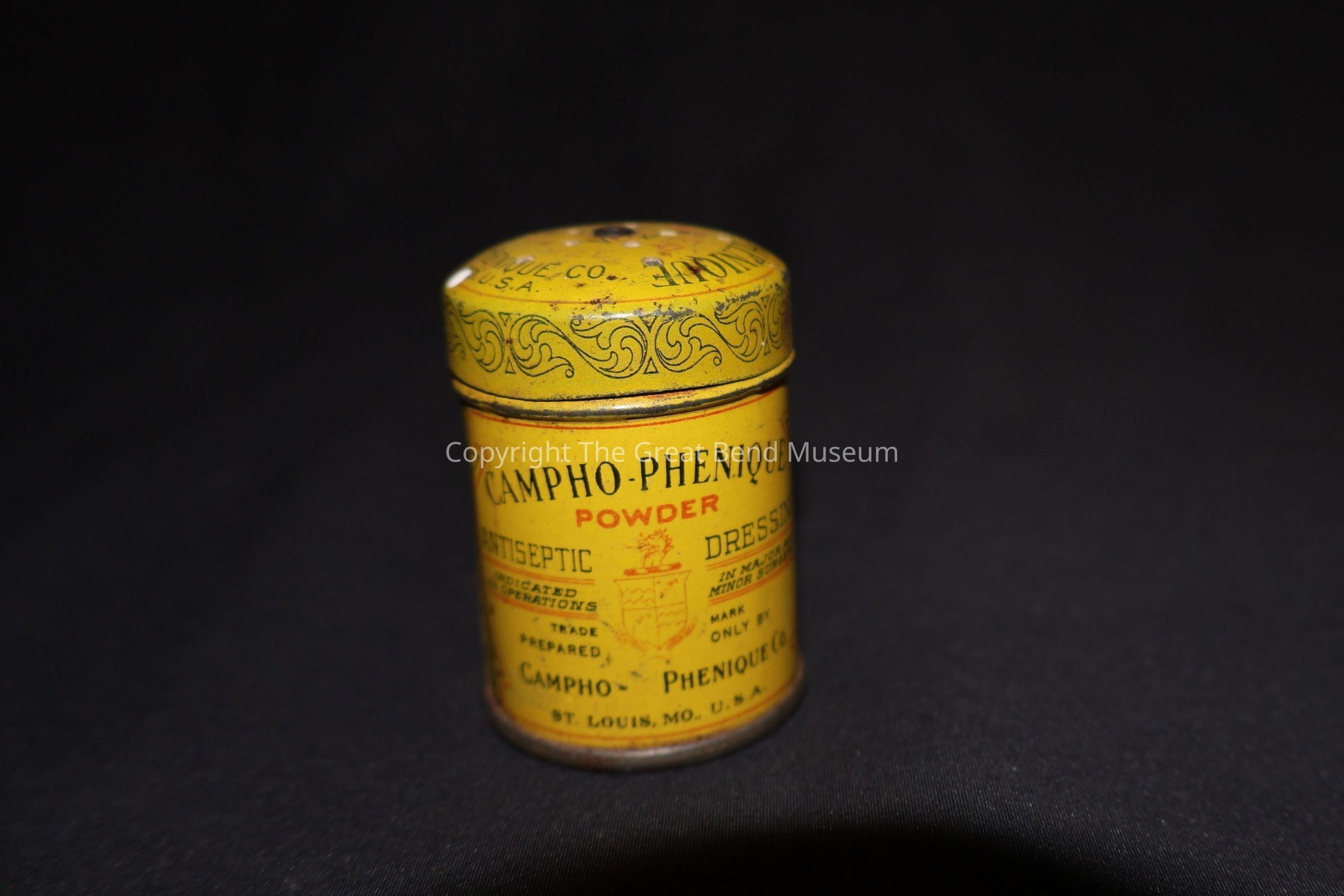 small yellow canister - with painted label that says" Campho - Phenique" powder. Label is black and red ink. It also says "Antiseptic Dressing"