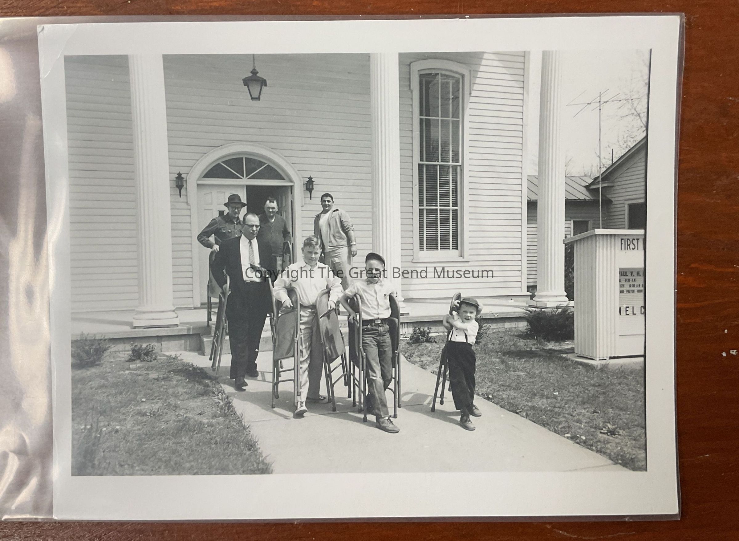 Men and Boys carrying folding chairs out of Ravenswood First Baptist Church for the $5 Banquet at Ravenswood High School --1956Acquisition