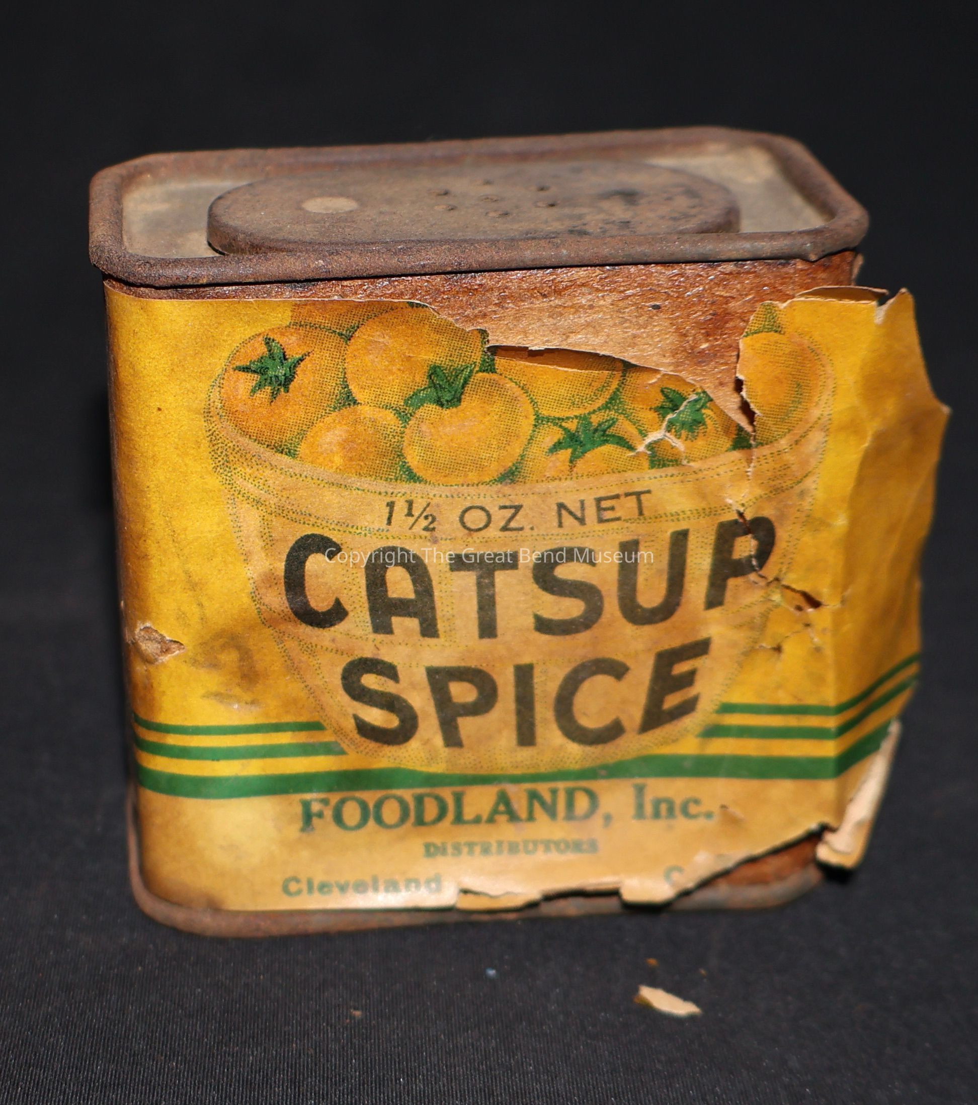 spice tin, 7 holes on top, yellow package wrap with 3 green lines, back has recipe for tomato catsup. Picture on front with a bowl of tomatoes black lettering 1/2 oz new catsup spice. Green lettering Foodland, inc distributors. Other panel black lettering, made from cloves all spice cayenne pepper, cinnamon, celery seed, ginger pepper, paprikaAcquisition