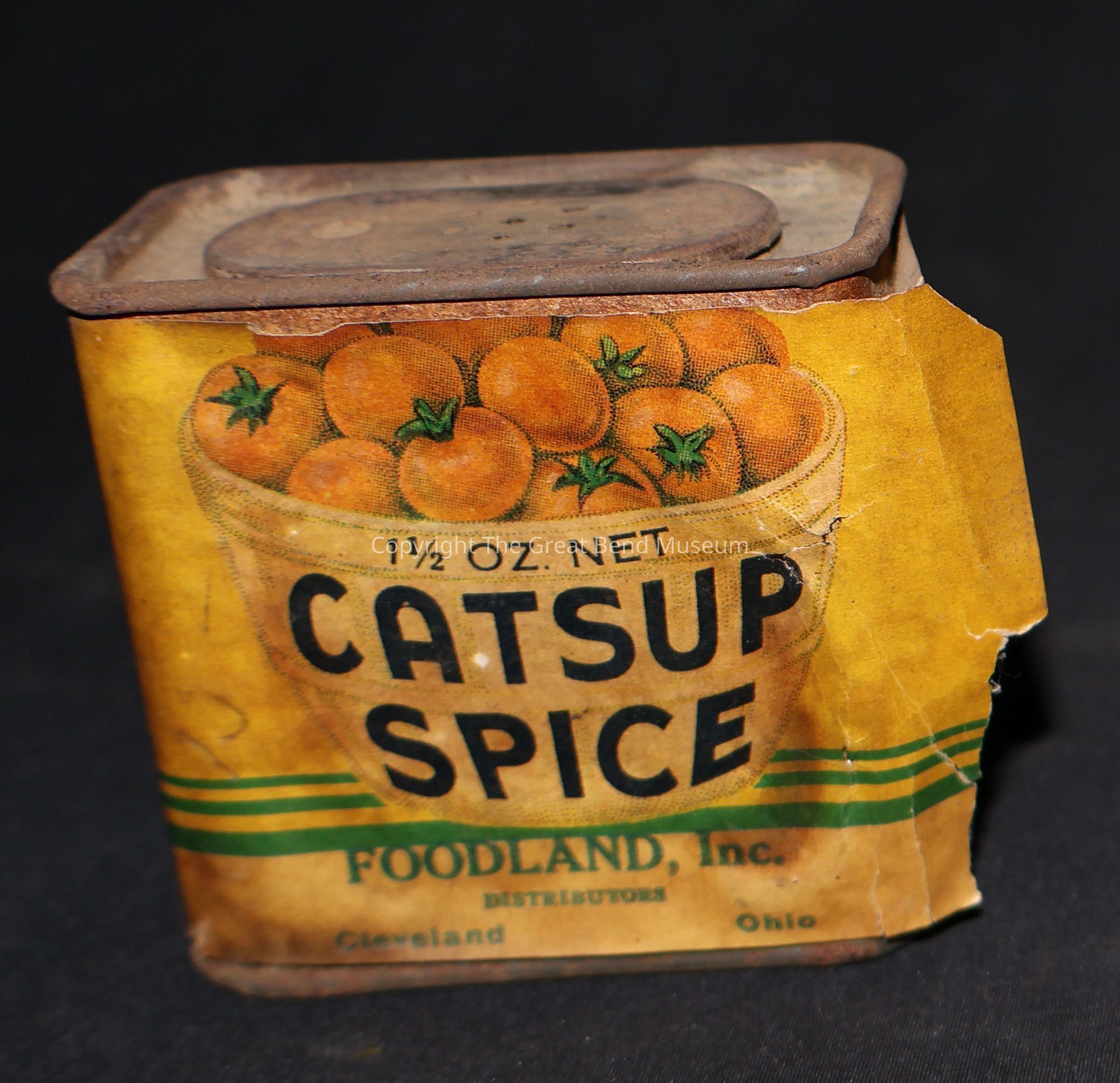 spice tin, 7 holes on top, yellow package wrap with 3 green lines, back has recipe for tomato catsup. Picture on front with a bowl of tomatoes black lettering 1/2 oz new catsup spice. Green lettering Foodland, inc distributors. Other panel black lettering, made from cloves all spice cayenne pepper, cinnamon, celery seed, ginger pepper, paprikaAcquisition