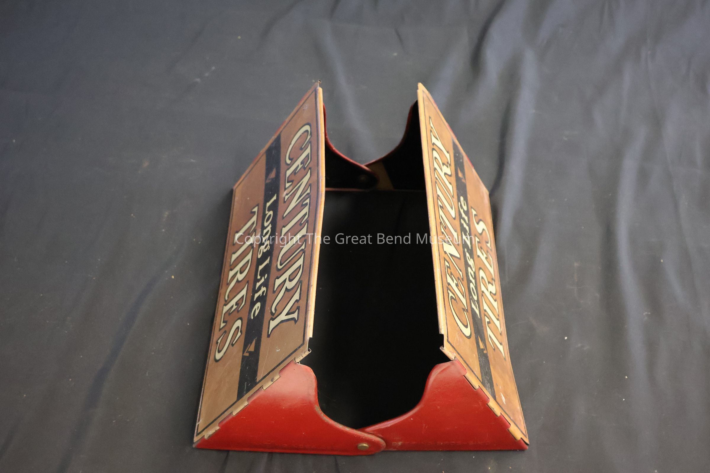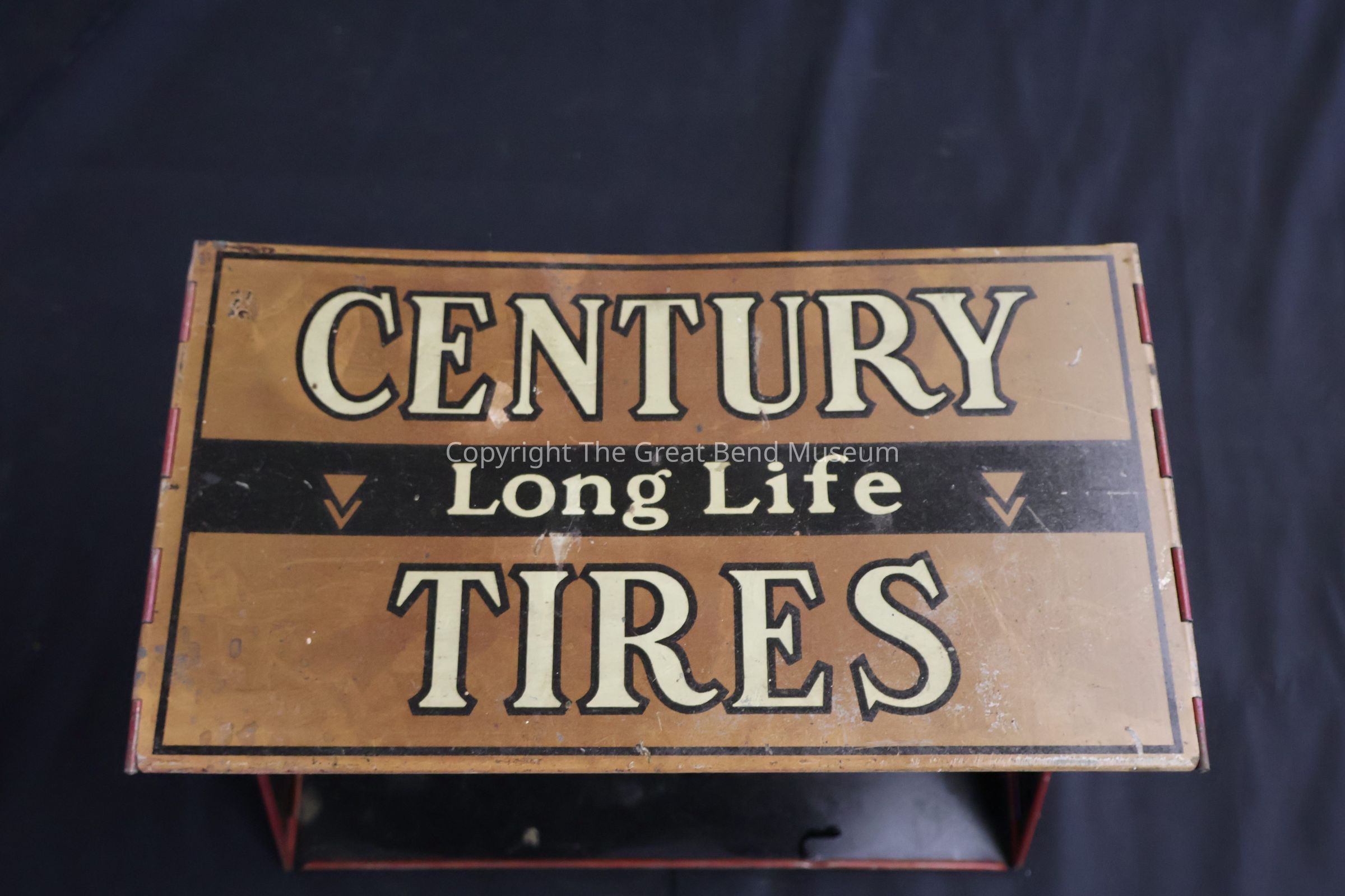 Red rectangular box with top cutout. Century in capitol letters with a shade of yellow behind it, long life in capitols and in white, in between yellow arrows, all behind a black strip, then tires on capitols and white and yellow behind it. The back is a stand.Acquisition