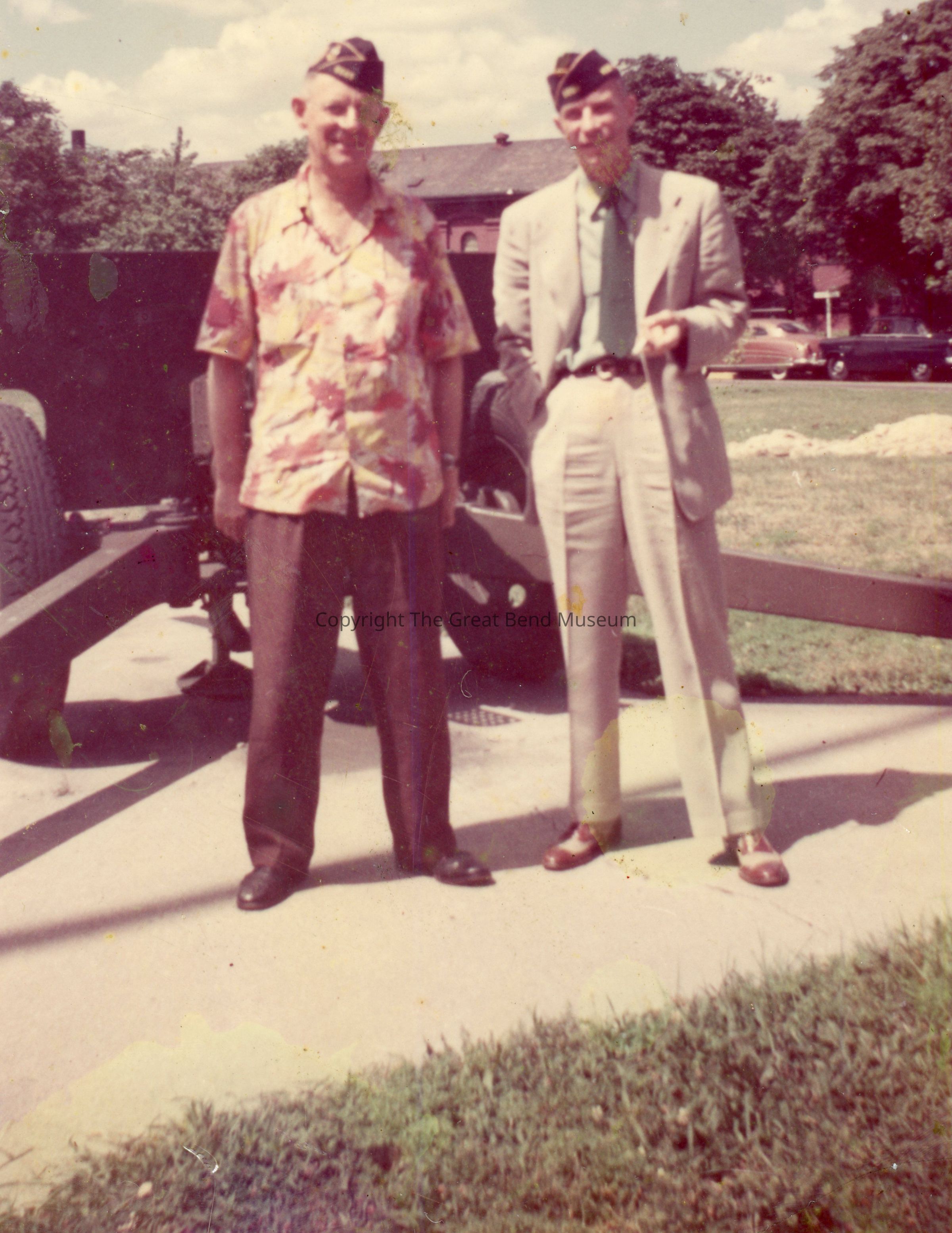 Charlie Fast and Fred Anderson at a VFW event, ca 1950. Charlie in casual clothes - print shirt/dark pants; Fred in light suit/tie. Background looks like the cannon in Veteran's Park and cars in far background, but the building behind isn't local. From Fast scrapbook, photo of post office on opposite side.Photograph Details