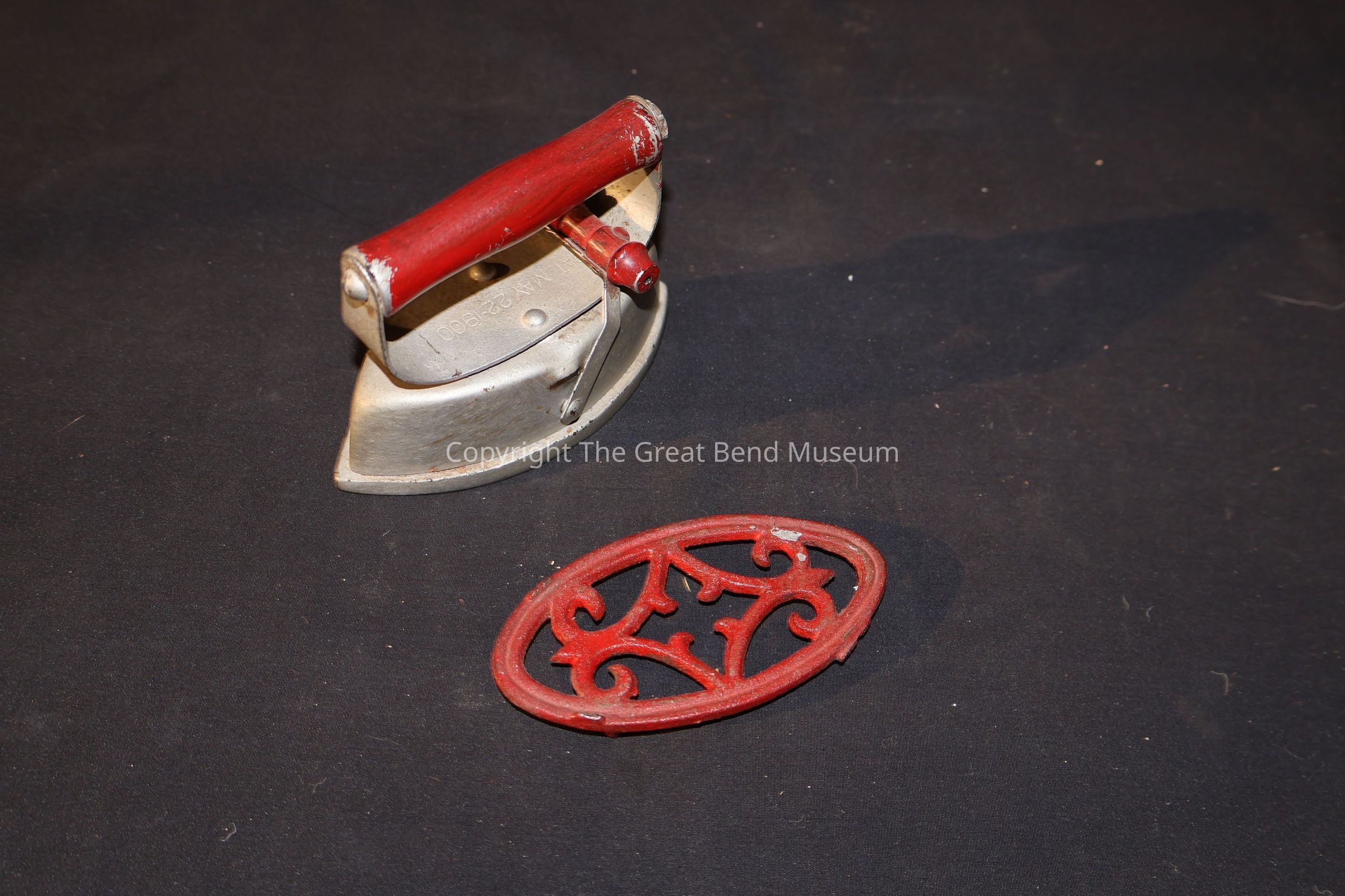 Iron for clothes - handle is bolted to the base of the iron, with the grip of handle screwed to top ends of handle base, the handle is red with some scuffing at each end and underneath a smaller handle is v\bolted to each side of base of handle, and can be moved, the handle on this is red. There is a stand to sit the iron on -- it is red - with some scuffing on handle.
