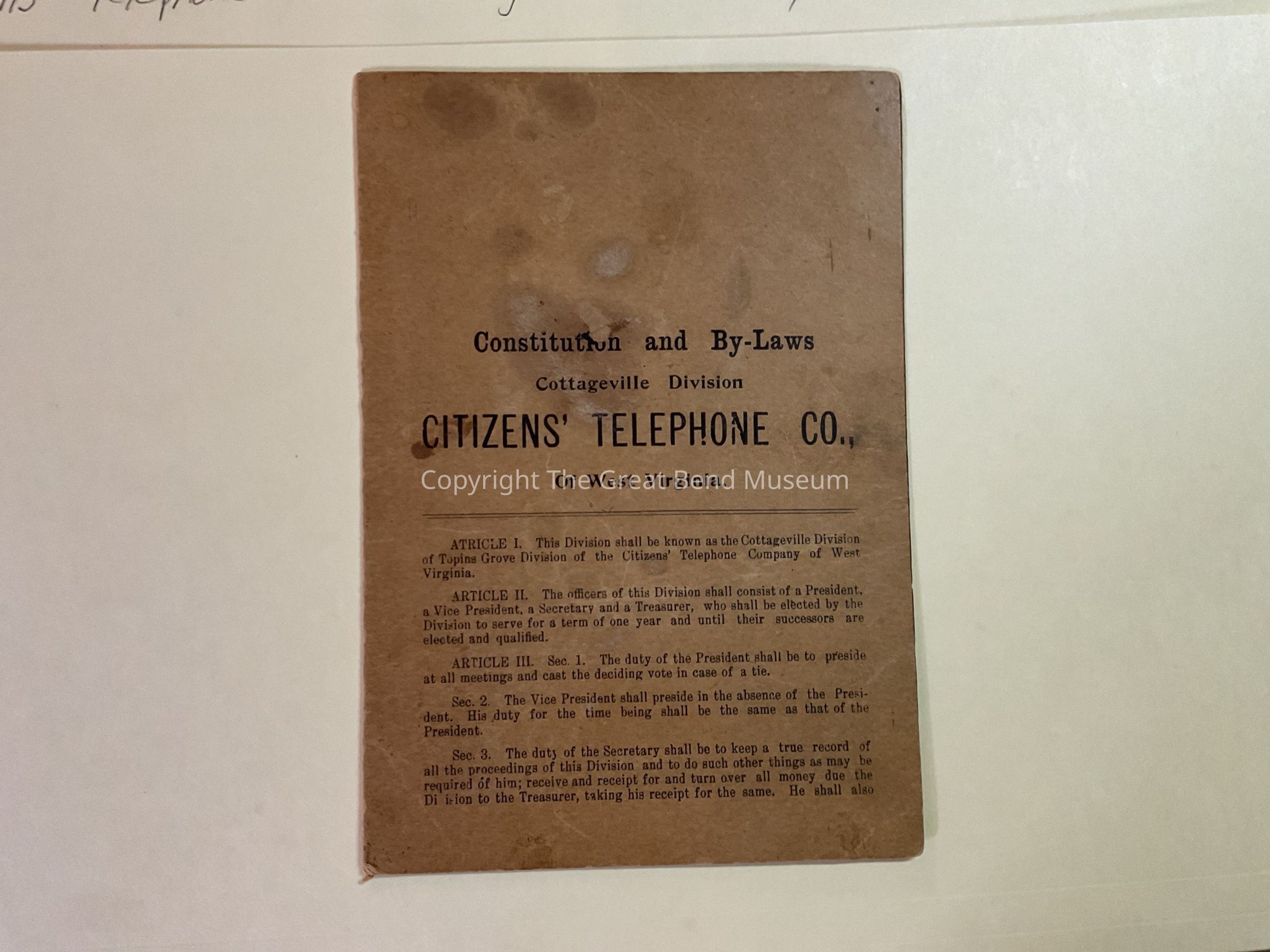 Bylaws of Citizens Telephone Cooperative, which was formed by citizens to bring affordable, reliable phone service to their community. Member based cooperative - Cottageville, WV. Rules on Regulations pertaining to members and office holders. Pres. - J. W. Gillaski. V. Pres. - E. W. Glaze, Sec. - C. D. Malone, Treasurer - C. F. McCoy.Publication Details