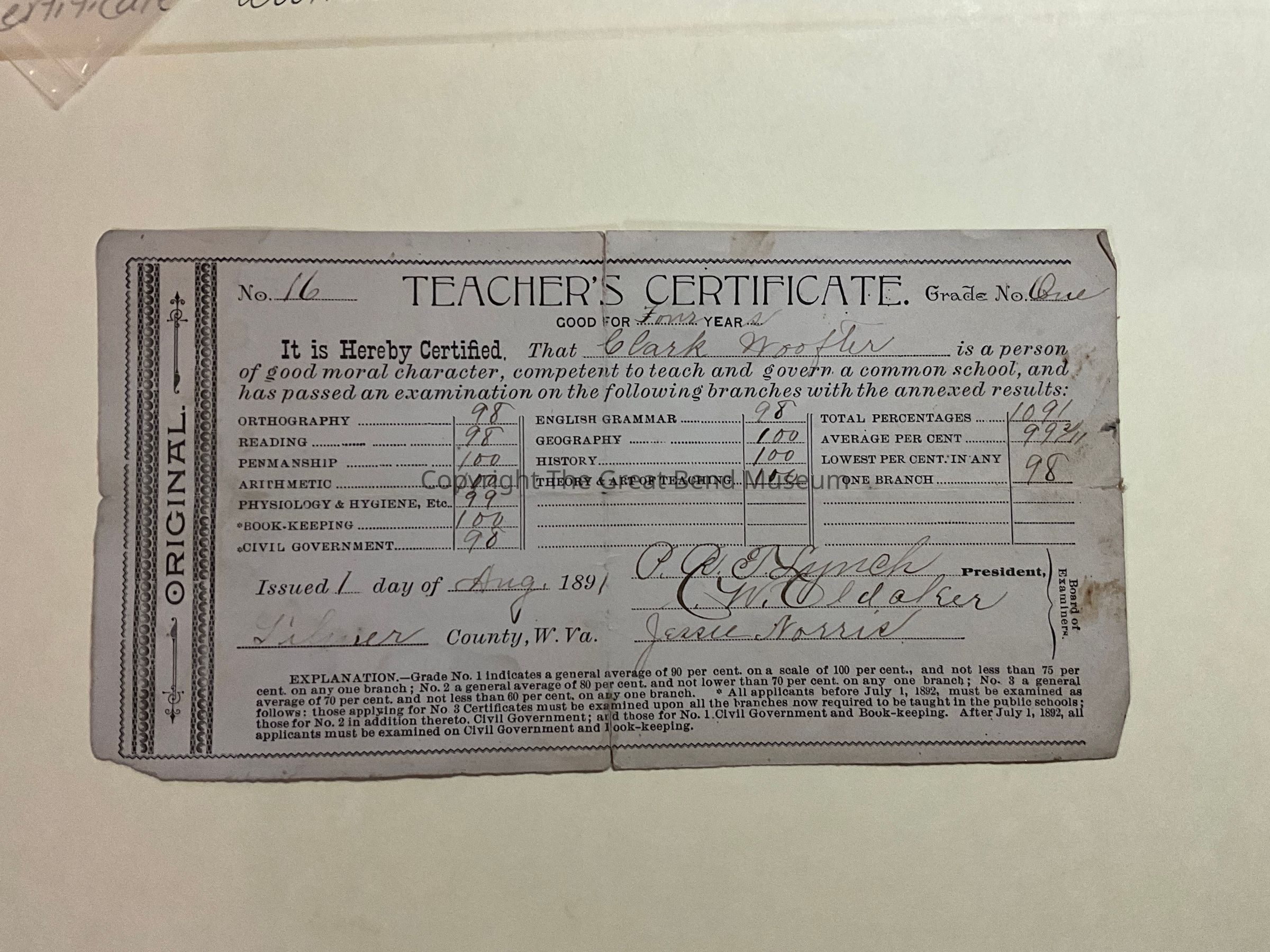 1891 Gilmer Teaching Certificate