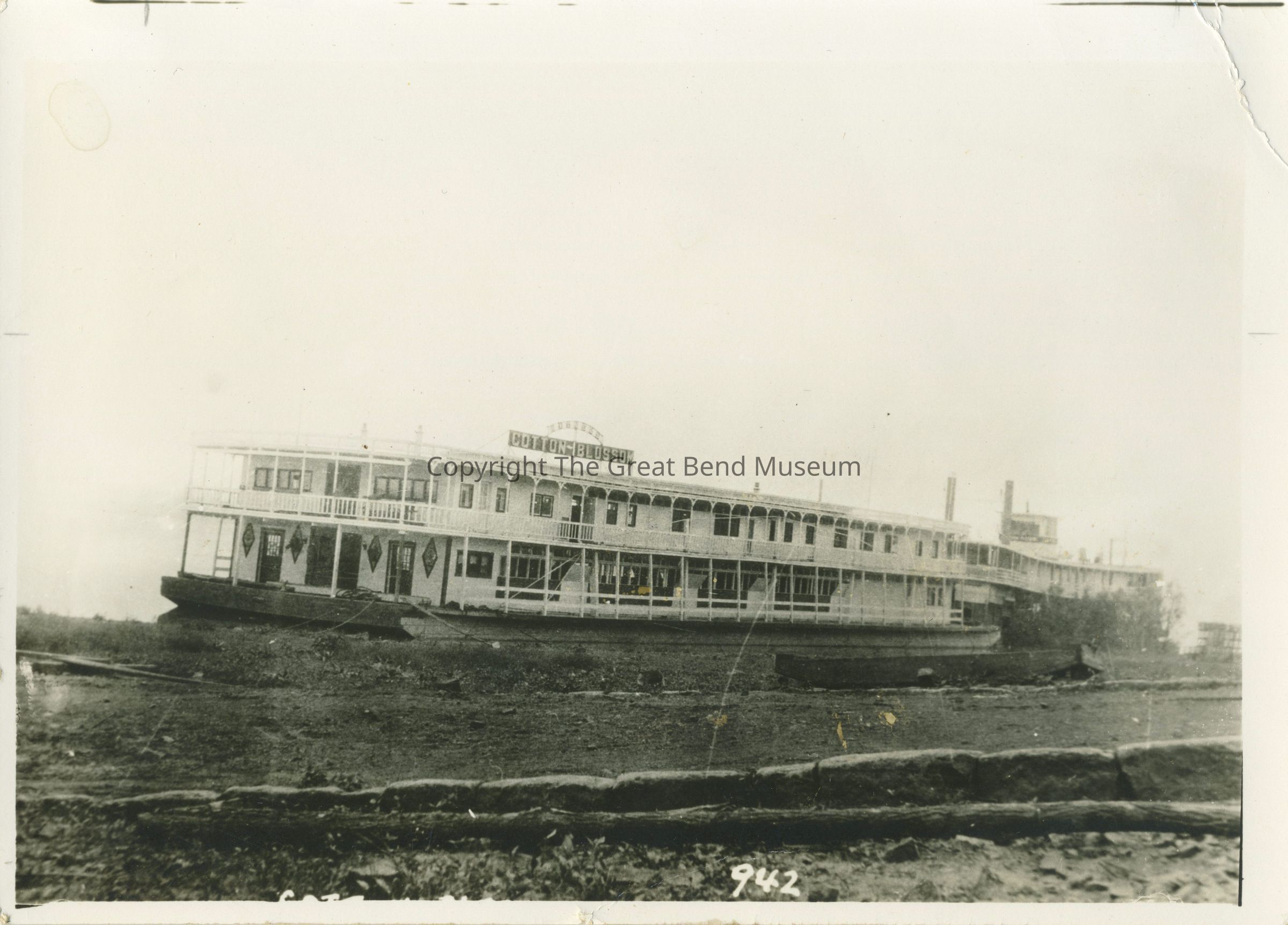 The image is of the "Cotton Blossom Ferry" docked at shore. There is a possible rowboat (?) at right, long dark structures at the bottom of the frame, possibly walls. 942 is at the bottom center of the frame. On the back - P. 2432 126% 3 x 22 134/15 (in red ink) Cotton BlossomAcquisition