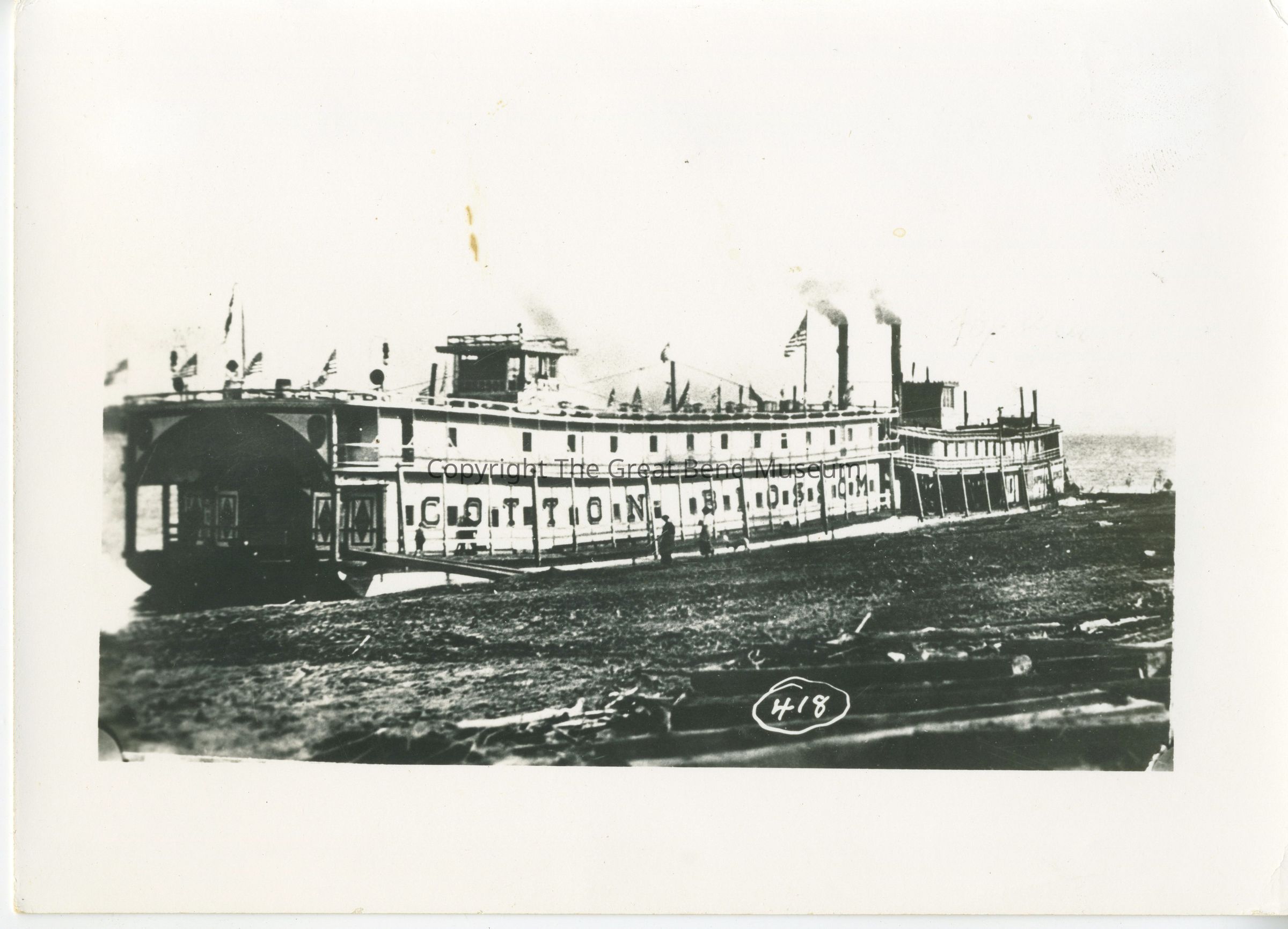 It is a photo of "The Cotton Blossom Fairy" docked, passengers are walking towards it. 418 is written at the bottom center of the frame. P-2427 is penciled at the back. It is mounted with 2020.05.01-04. It is removed from the original frame.Acquisition