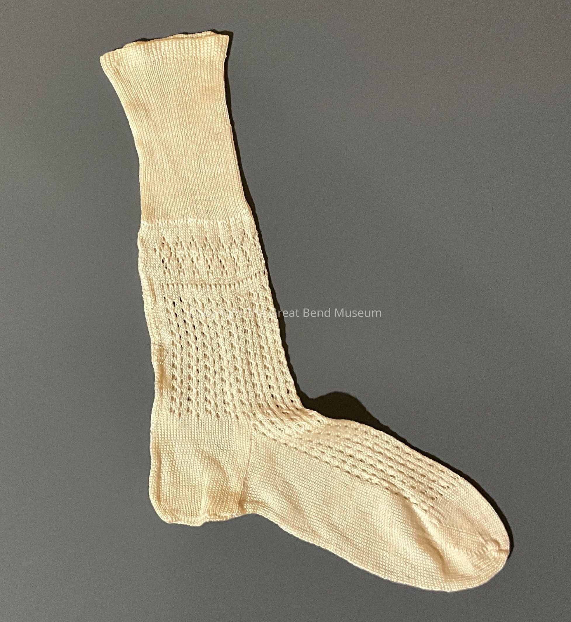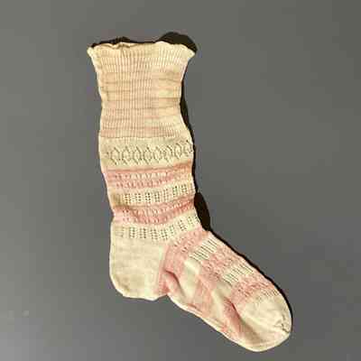 Pink and white children's sock (one of each color) knitted or crochet patterns at ankle and on top of foot. Yellowed.Acquisition
