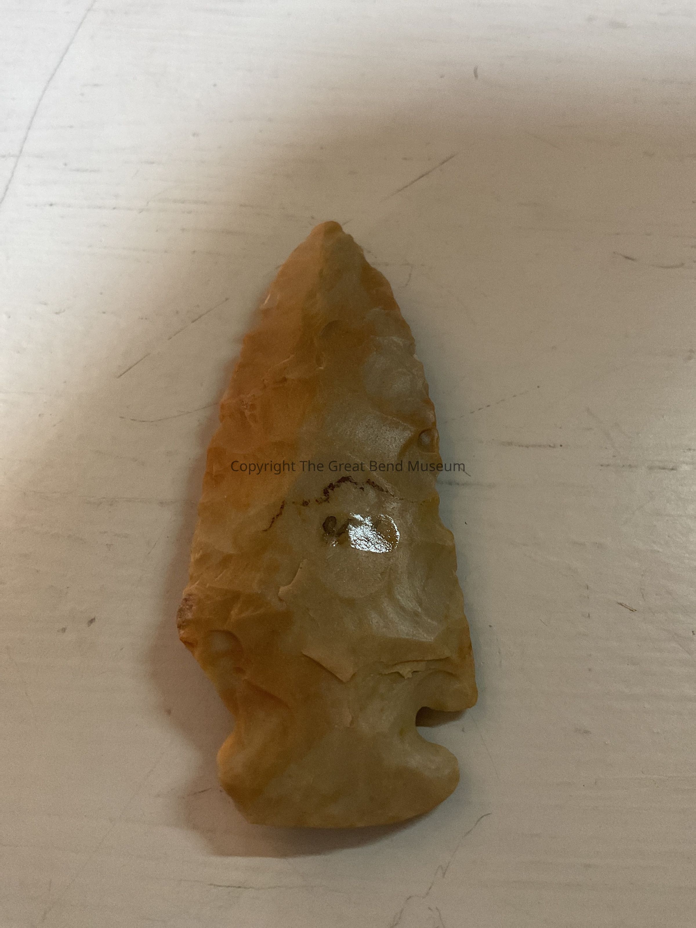Large light Brownish Gray point. One shoulder is chipped. Has prominent opposite shoulder. Long spear point. Expanding dovetail base is ground thin.Made/Created