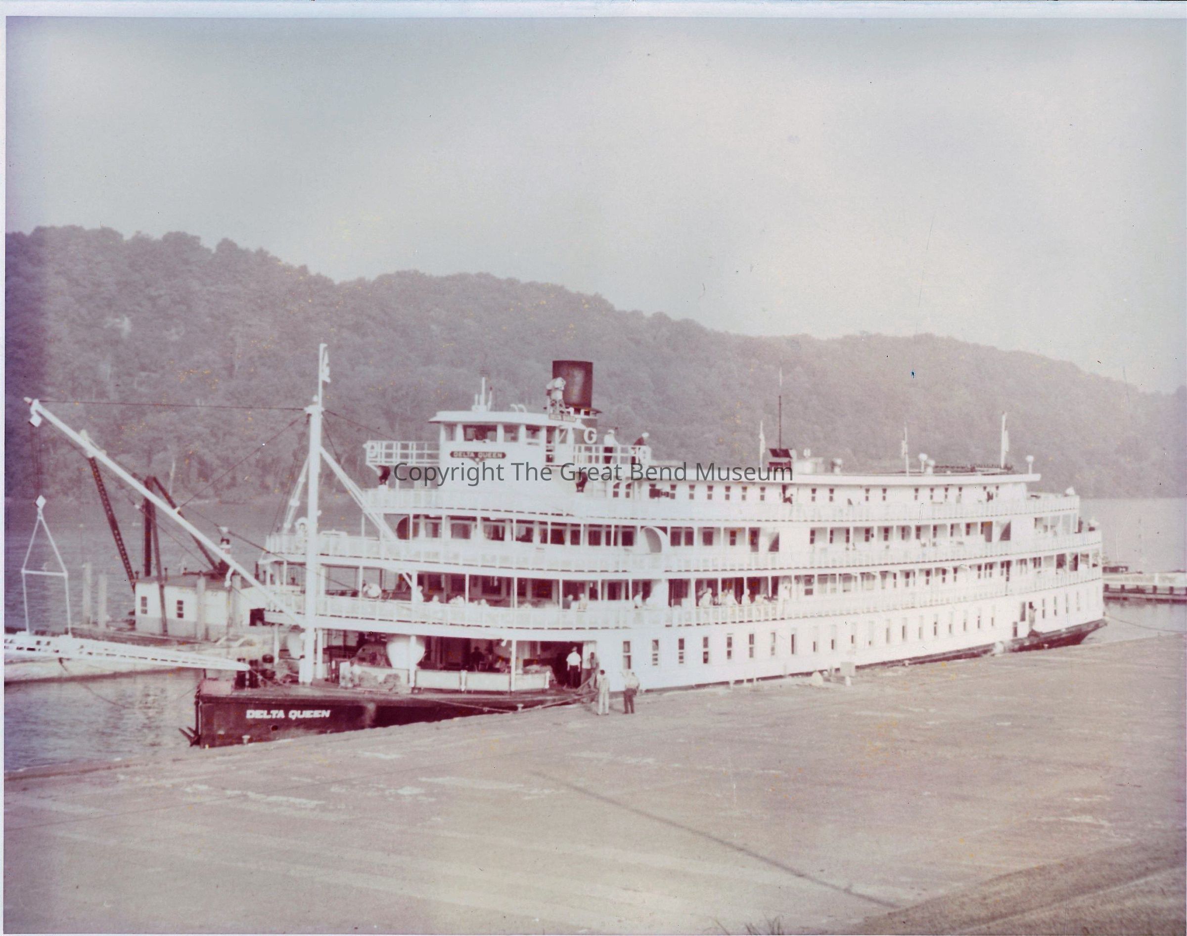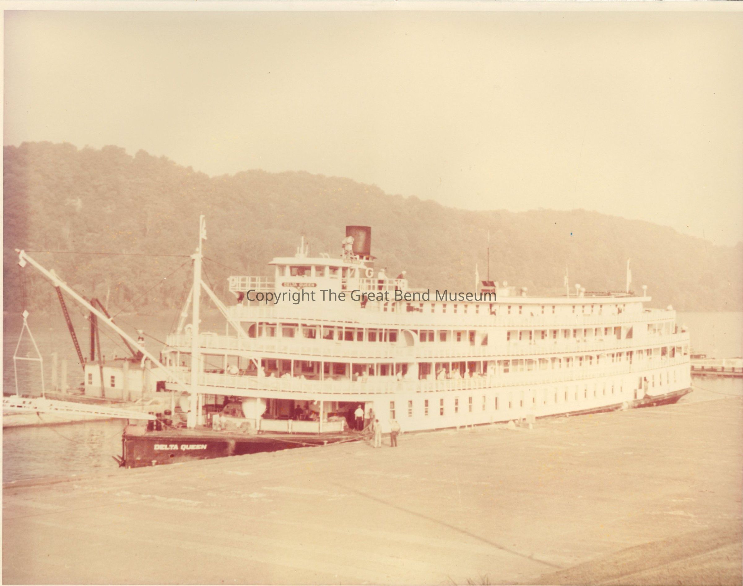 Image of the "Delta Queen" steamship/ferry at dock (concrete). There is a tugboat beyond with four figures boarded and more seated on covered porch at the front.