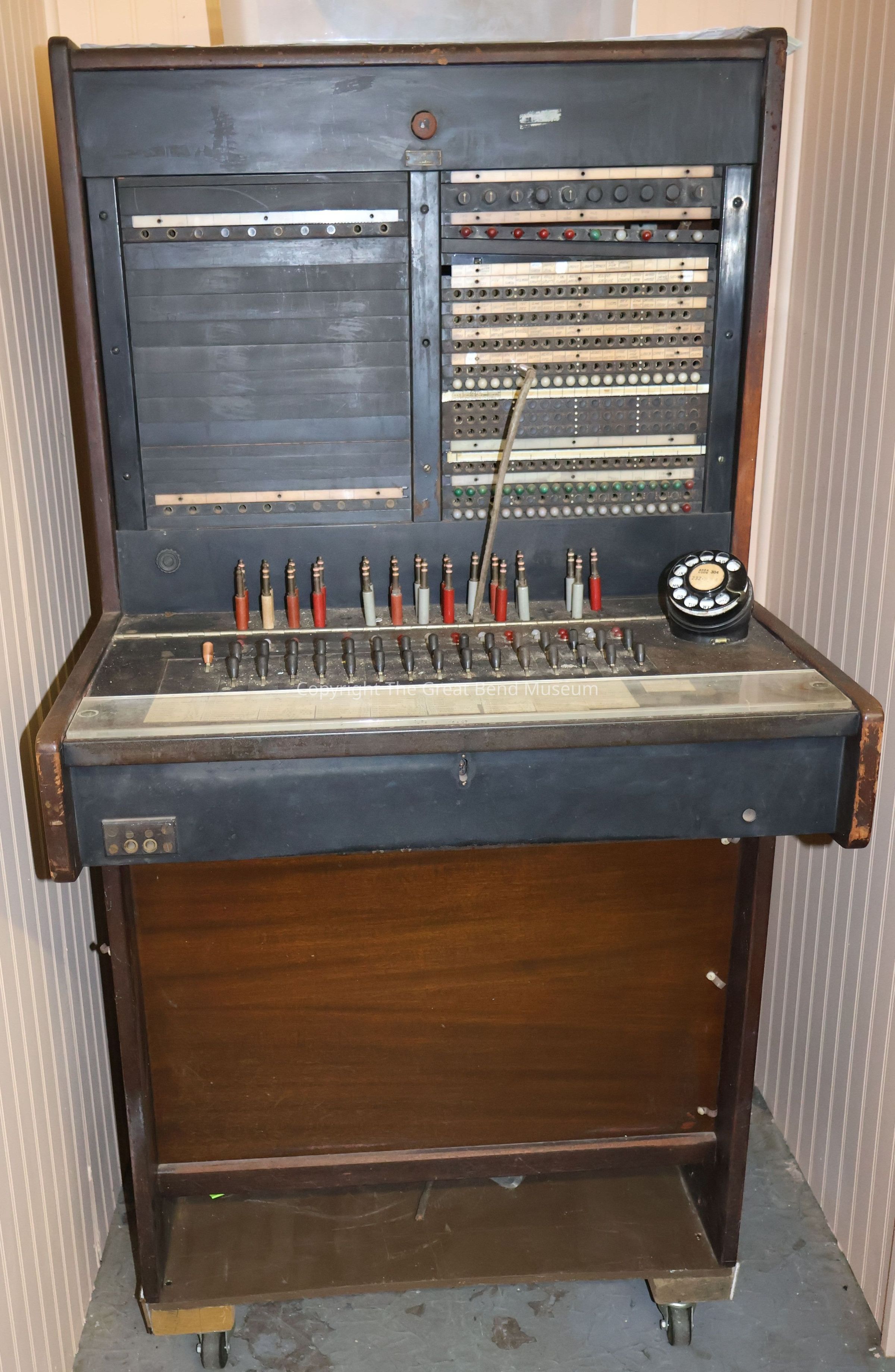 Rectangular structure with front outjutting panel. 31 switches, 30 buttons on panel with paper directory (141 departments). Circular dial on right side with 304 area code. 30 slots with wires, most connected to upper vertical panel with connector slots, labels. Electrical elements hidden behind panels in rest of "box." Reddish brown wood very likely cherry veneer. Telephone switchboard c. 1949 West Electric. Used by donor's mother at a department store in Wheeling, WV.Acquisition
