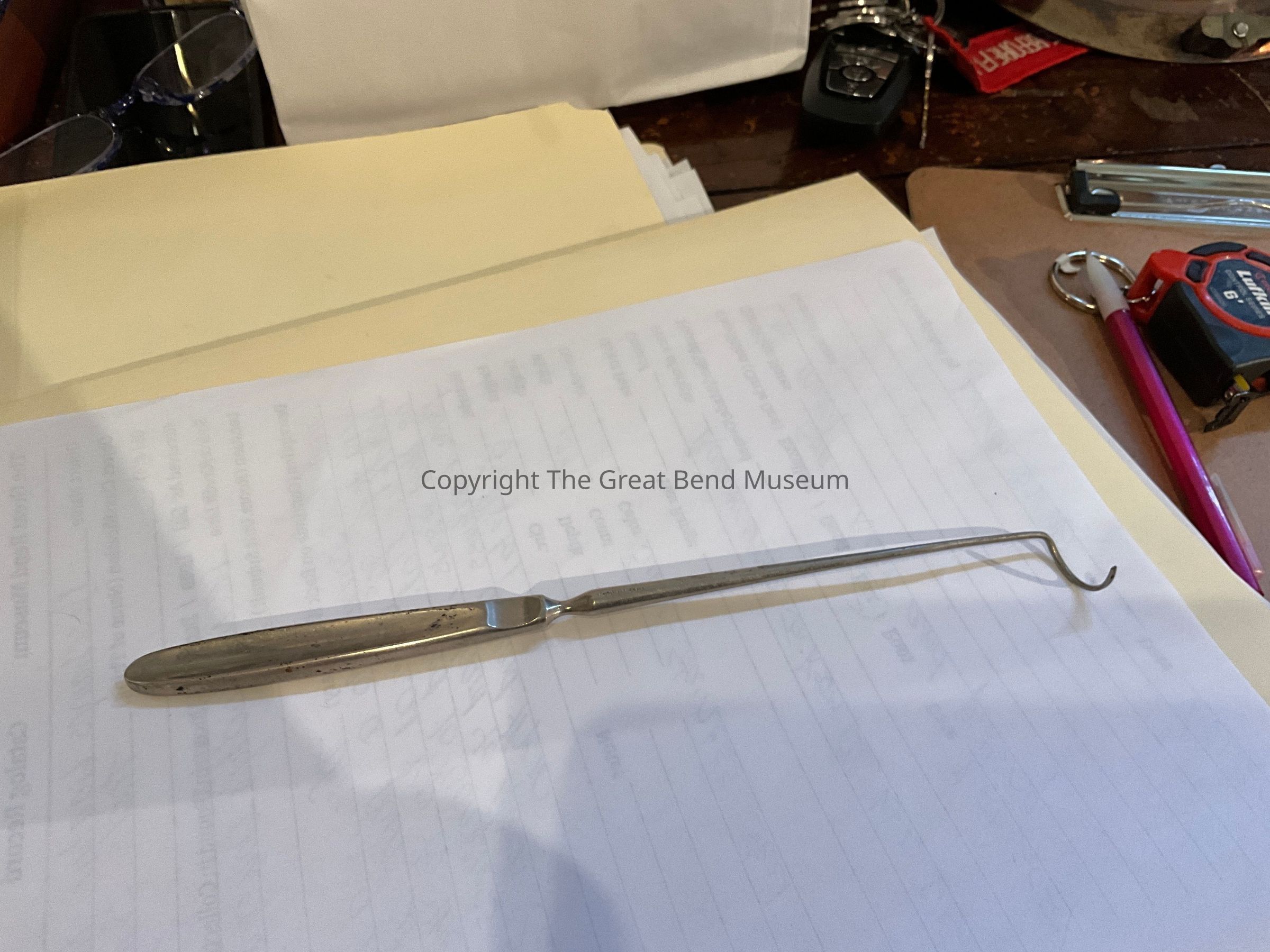 Long thin rod. Curved to a point at the top of the rod. Handle is flat it was used to compress aneurysm or blood vessels in hard to reach sites and place ligatures around them.Acquisition