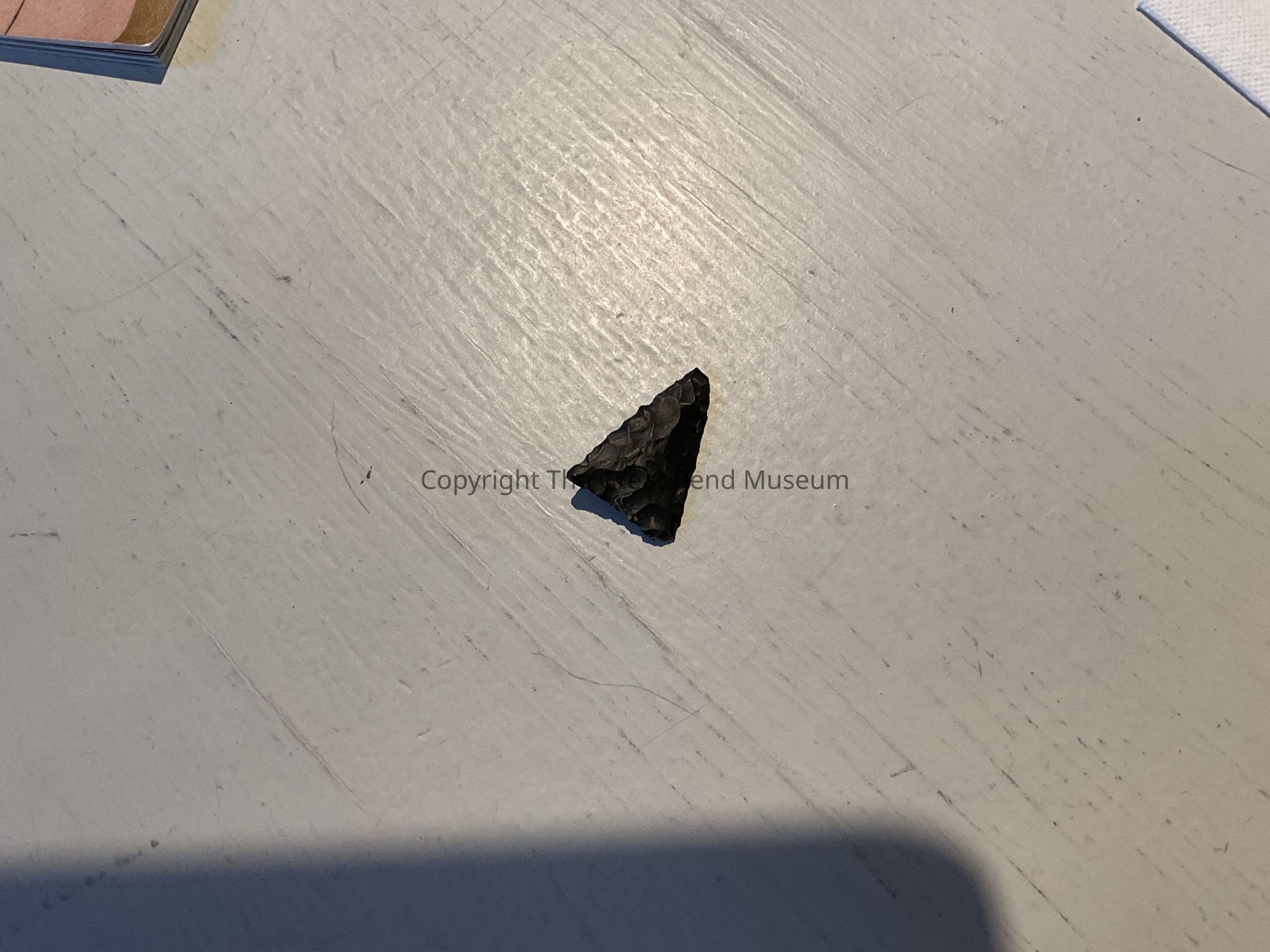 Small black triangularpoint edges straight. Dark Flint sharp point . Very thin isosceles triangular shaped point. Edges are serrated.Acquisition