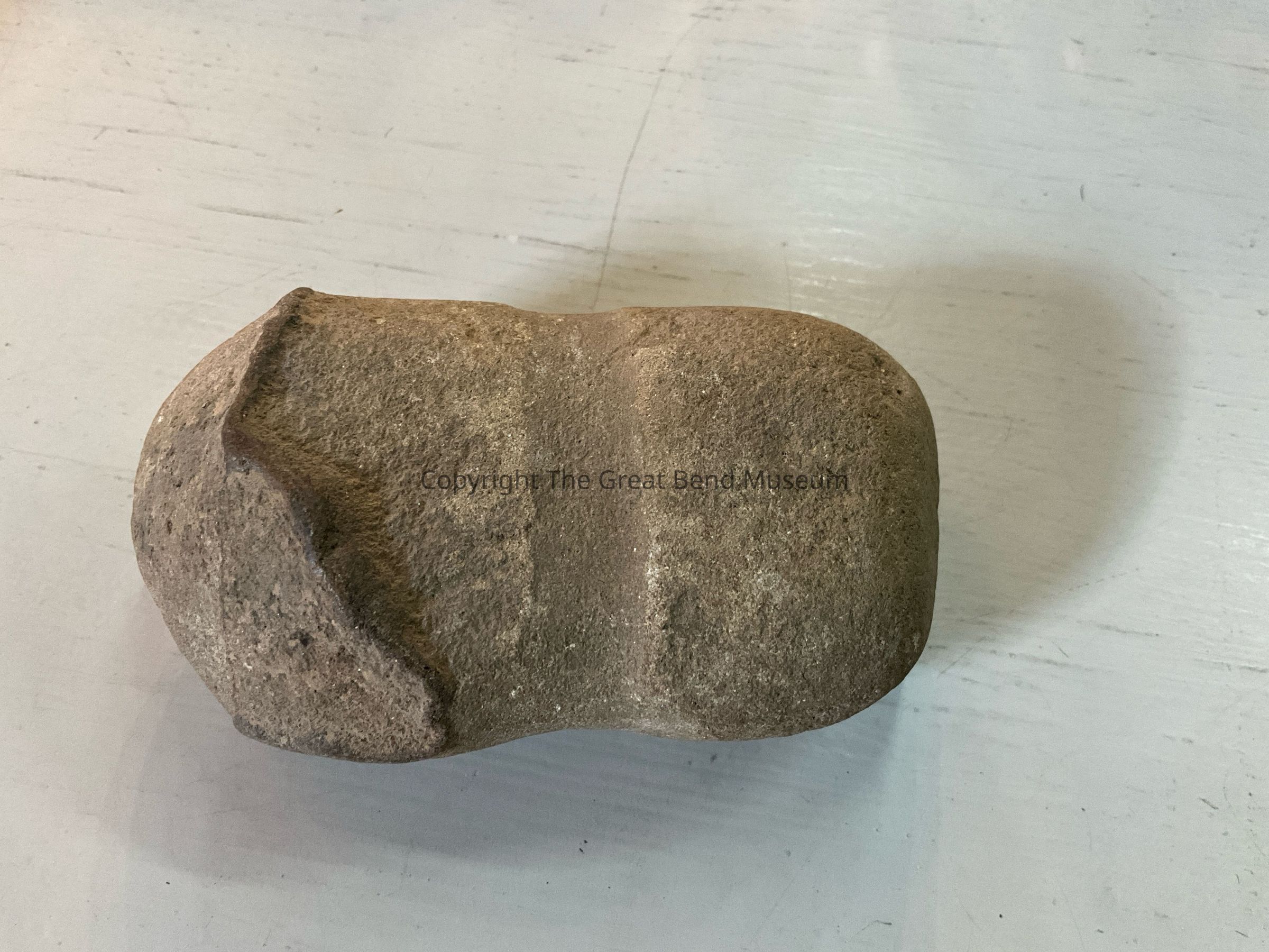 Large, heavy piece of stone, smoothed sand stone used as an hatchet or axe. Has a groove off center for attaching handle. Both ends of the stone are rounded smooth. Light brown in color.Use
