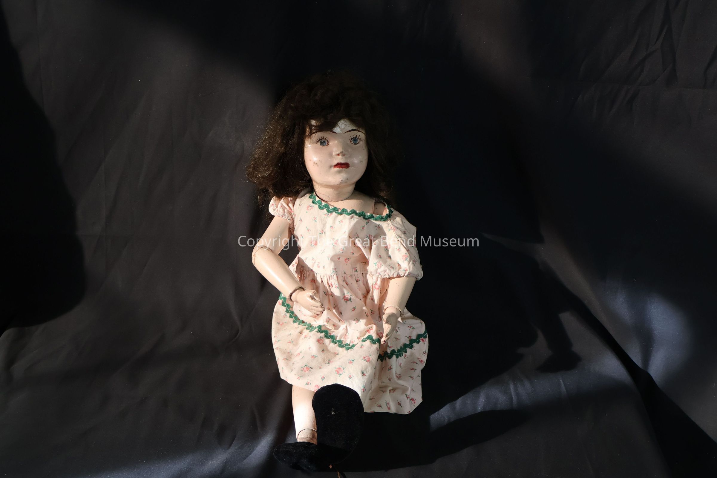 Large doll with pink sprigged dress, brown hair, painted face, blue eyes. Spring loaded joints -- neck, shoulders, elbows writs, legs, knees, ankles. Black velvet shoesAcquisition