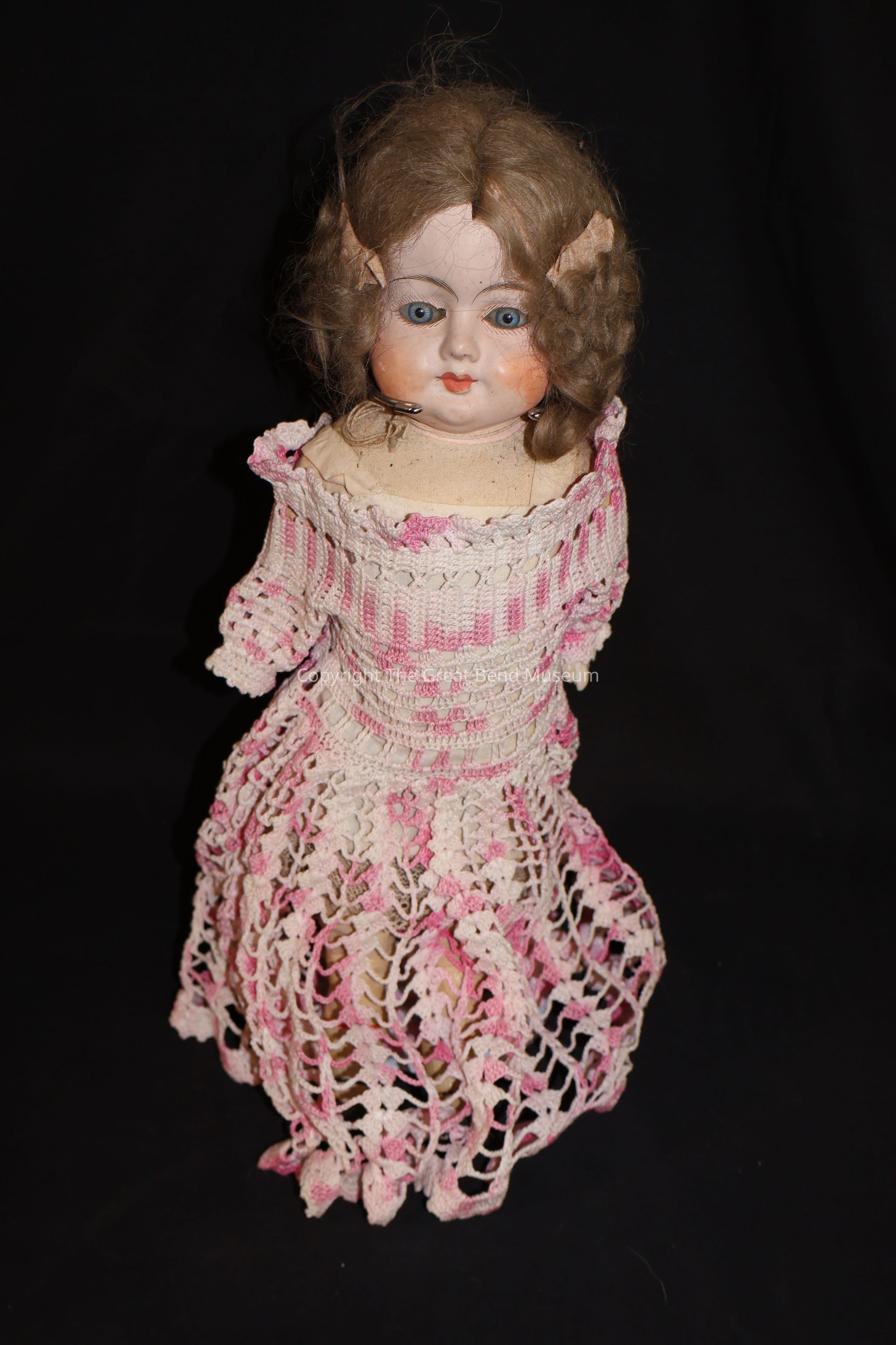 Porcelain doll with composition head, hands, feet, mohair hair, glass eyes, blonde-brown hair with two ribbons, curls (now matted.) Bue eyes, rosy cheeks in pink crocheted dress. According to correcting article largest doll (this one) possibly named 'Dolly.' Painted socks, lace undergarments, cloth body, thread tied around neckAcquisition