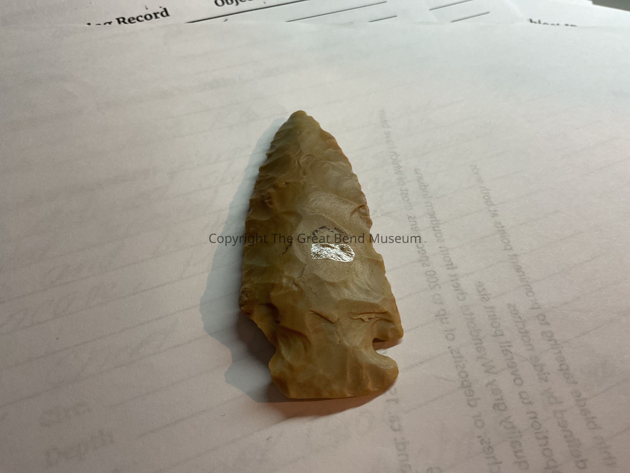 Large light brown/gray point. One shoulder is chipped has prominent opposite shoulder. It is a long spear point, base has one chipped side also. Stem is shaped in the “Dovetail” shape. Basal edge is also ground thin.Acquisition