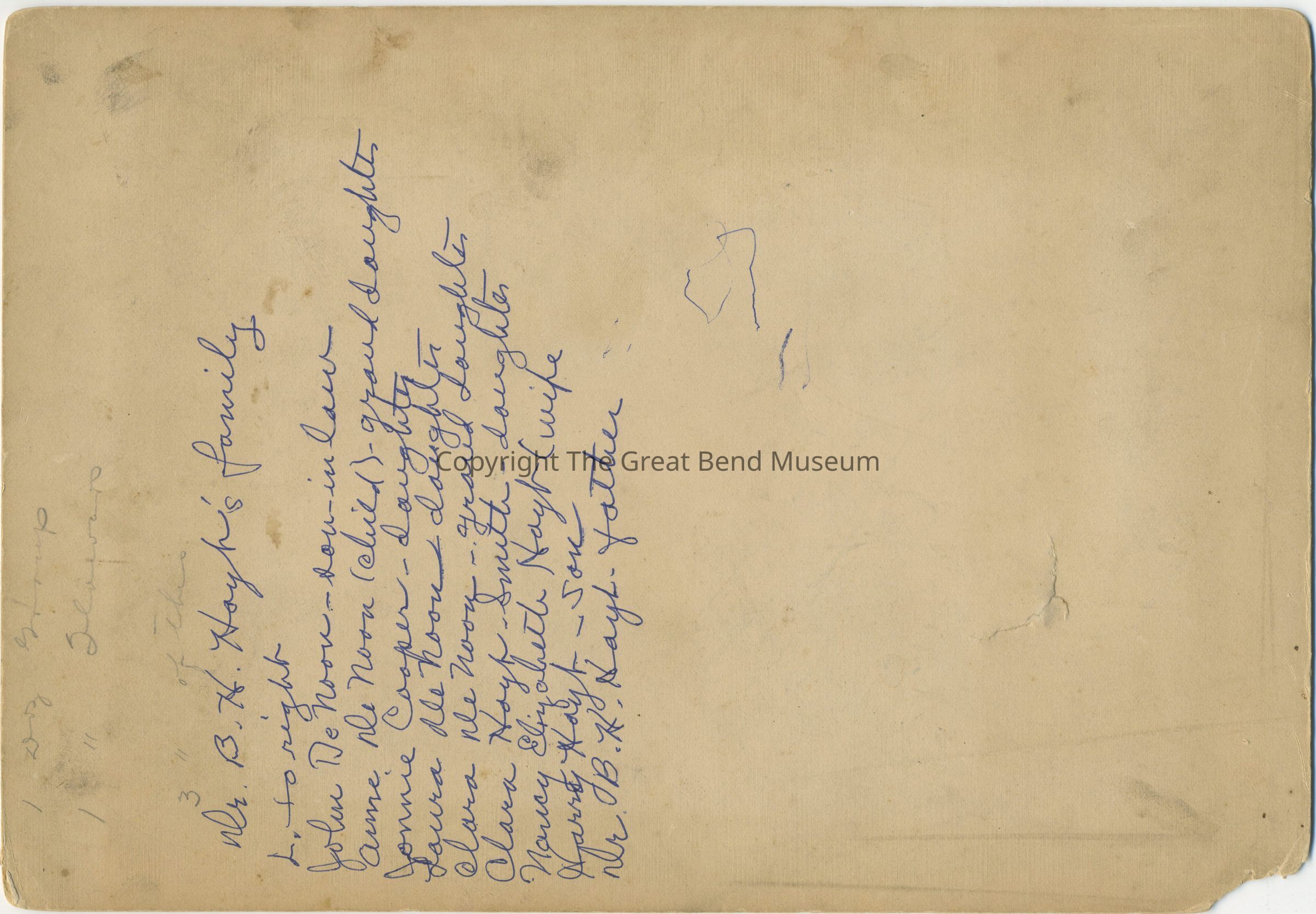 Written On Back; Dr. B. H. Hoyt's family: L to R---John DeNoon-Son-in-law; Anne DeNoon-Granddaughter; Jonnie Cooper-Daughter; Laura DeNoon-Daughter; Clara DeNoon-Granddaughter; Clara Hoyt Smith - Daughter; Nancy Elizabeth Hoyt-Wife; Harry Hoyt-Son; Dr. B. H. Hoyt-Father.Acquisition