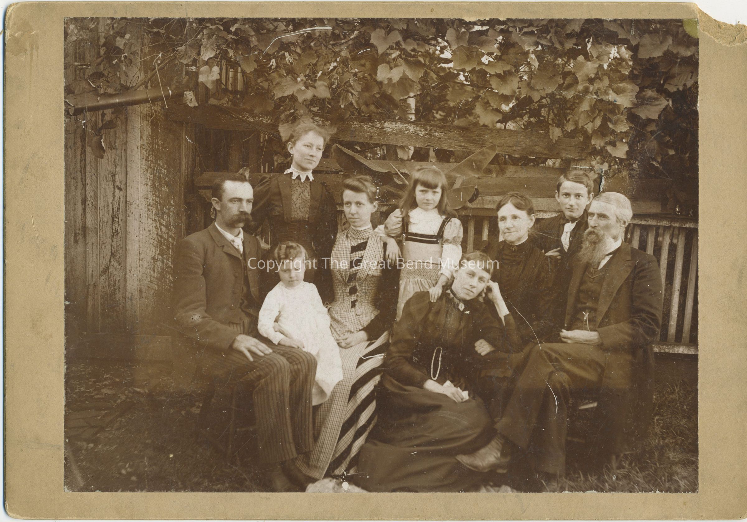 Photo of the family of Dr. Barzilla H. Hoyt. A surgeon during the Civil War. A prominent citizen of Ravenswood in the late 1880s. He and his wife Nancy are seated to the extreme right with his wife Nancy. Photo appears to be taken outdoors with railing behind, and tree leaves overhead. Mounted on cardstock.