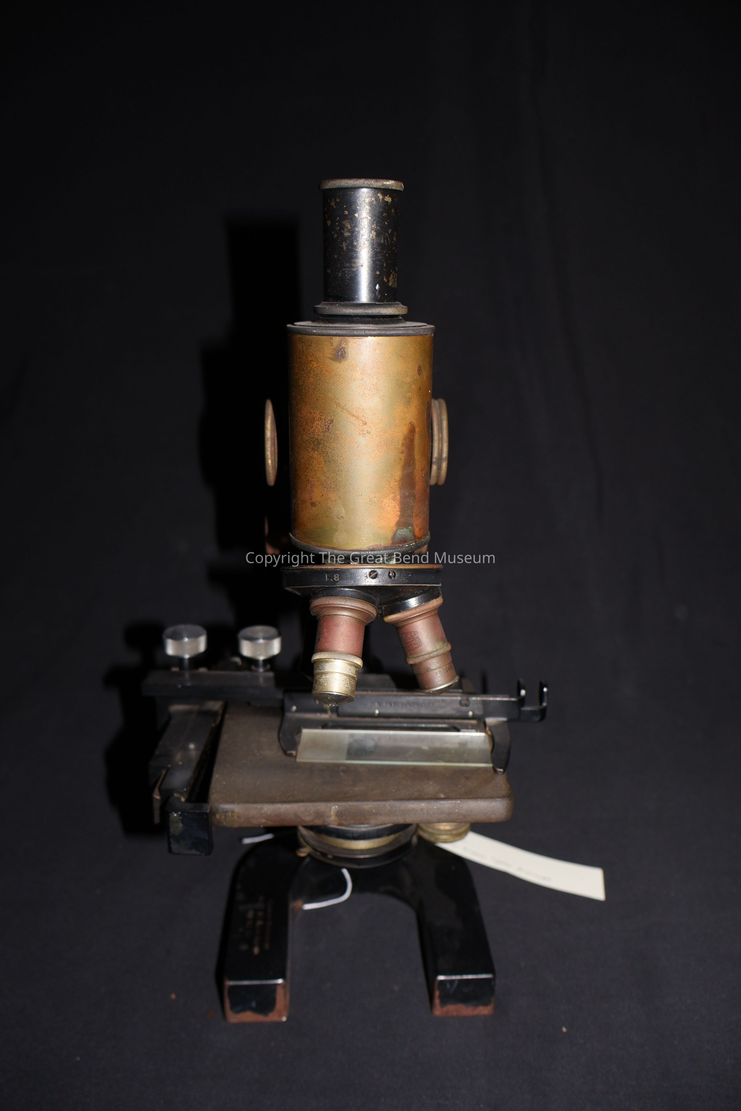 Microscope with slide and rotating lens. 2 stainless steel knobs on the gripper plate. Used in the Ravenswood Hospital by Dr. N. D. Priddy.