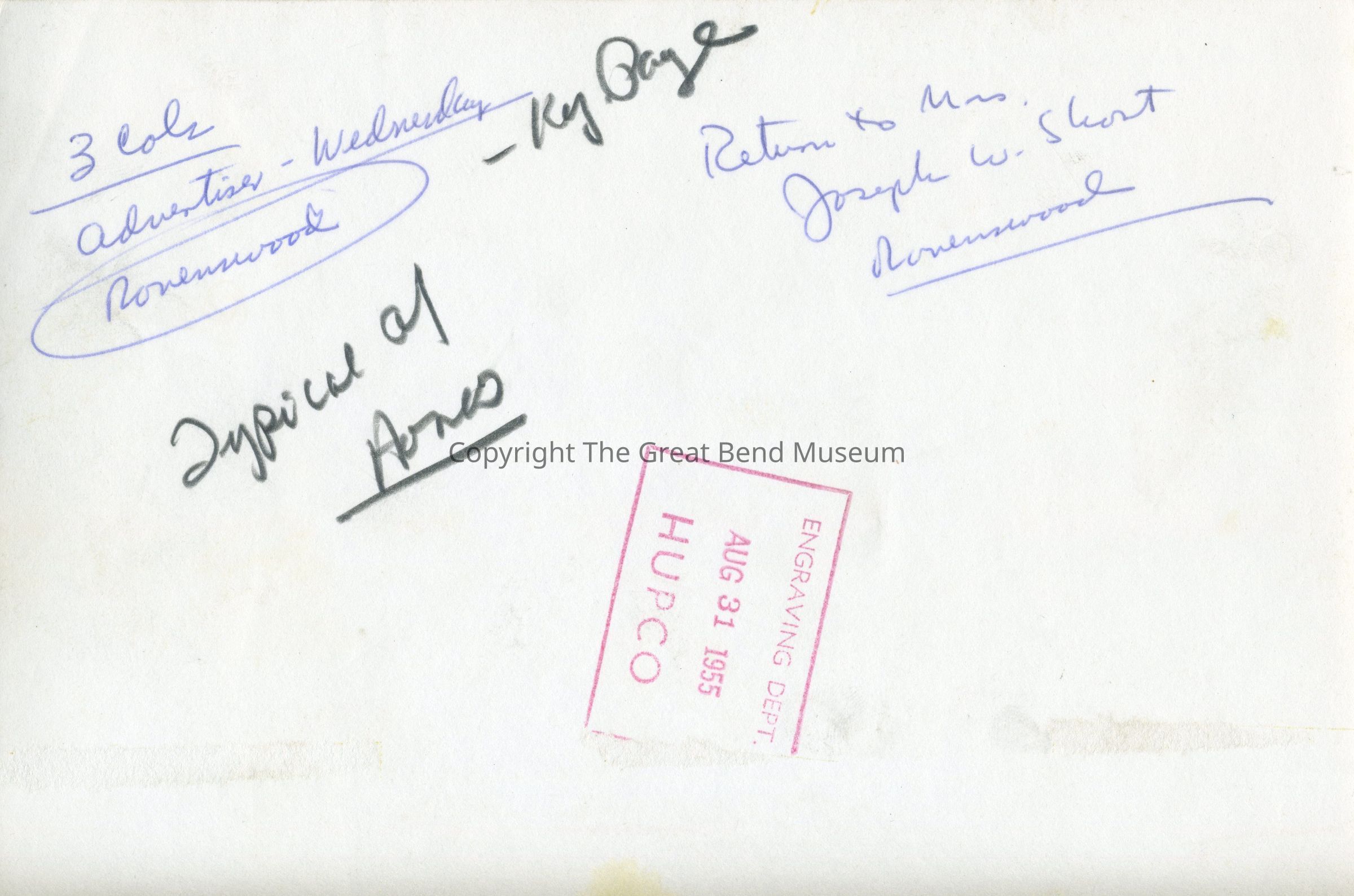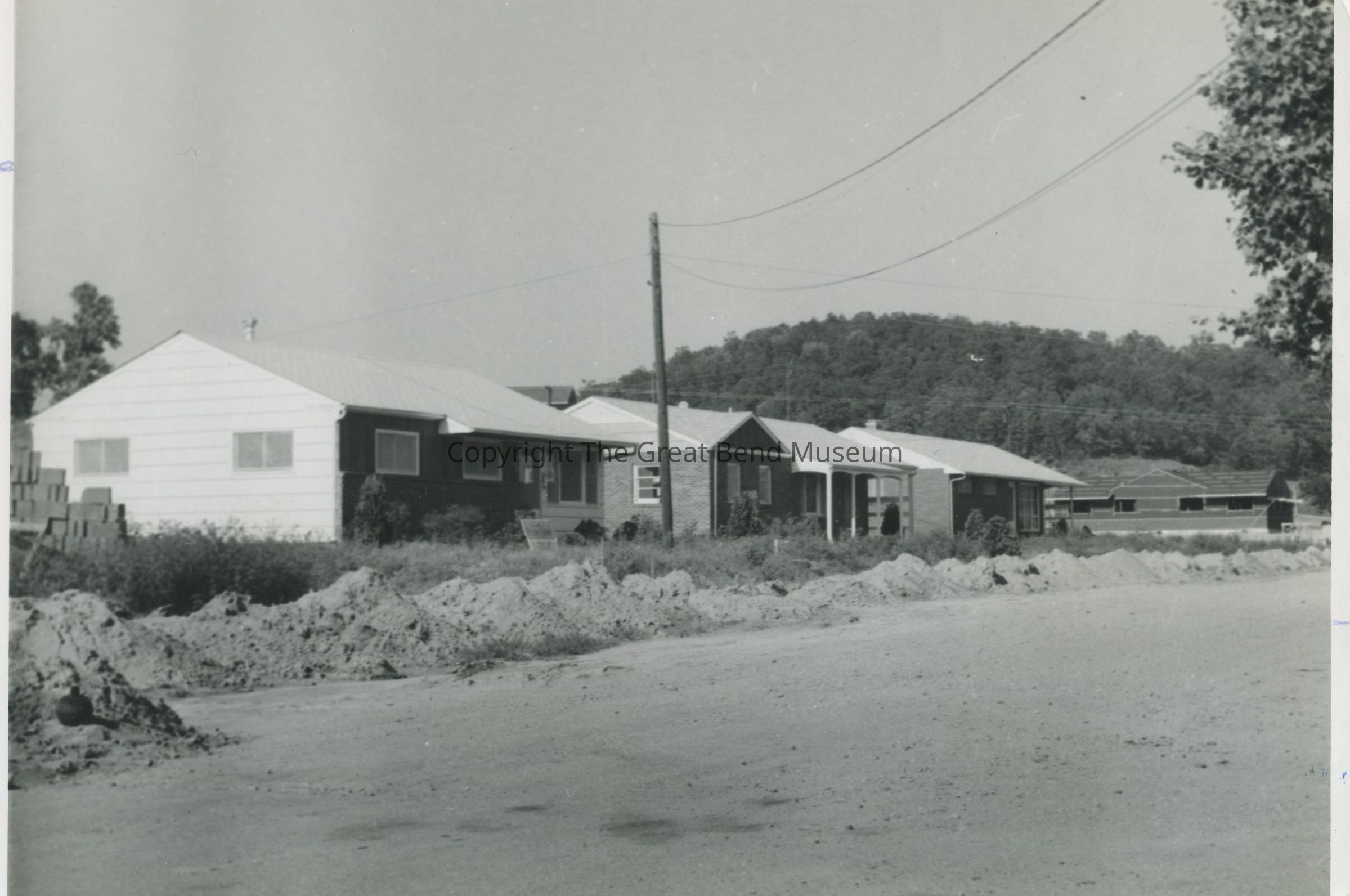 B/W photo -- New house construction - 3 houses; telephone pole Sep. #1 & 2; larger building at end of street (looks like a church - North Ravenswood -- possibly Church of Nazarene). On back: (ink) 3 col. advertise - Wednesday - Ravenswood, Return to Mrs. Joseph W. Short - Ravenswood. Typical of A ones - KY page. Red ink stamped Engraving dept Aug. 31, 1955 HUPCO