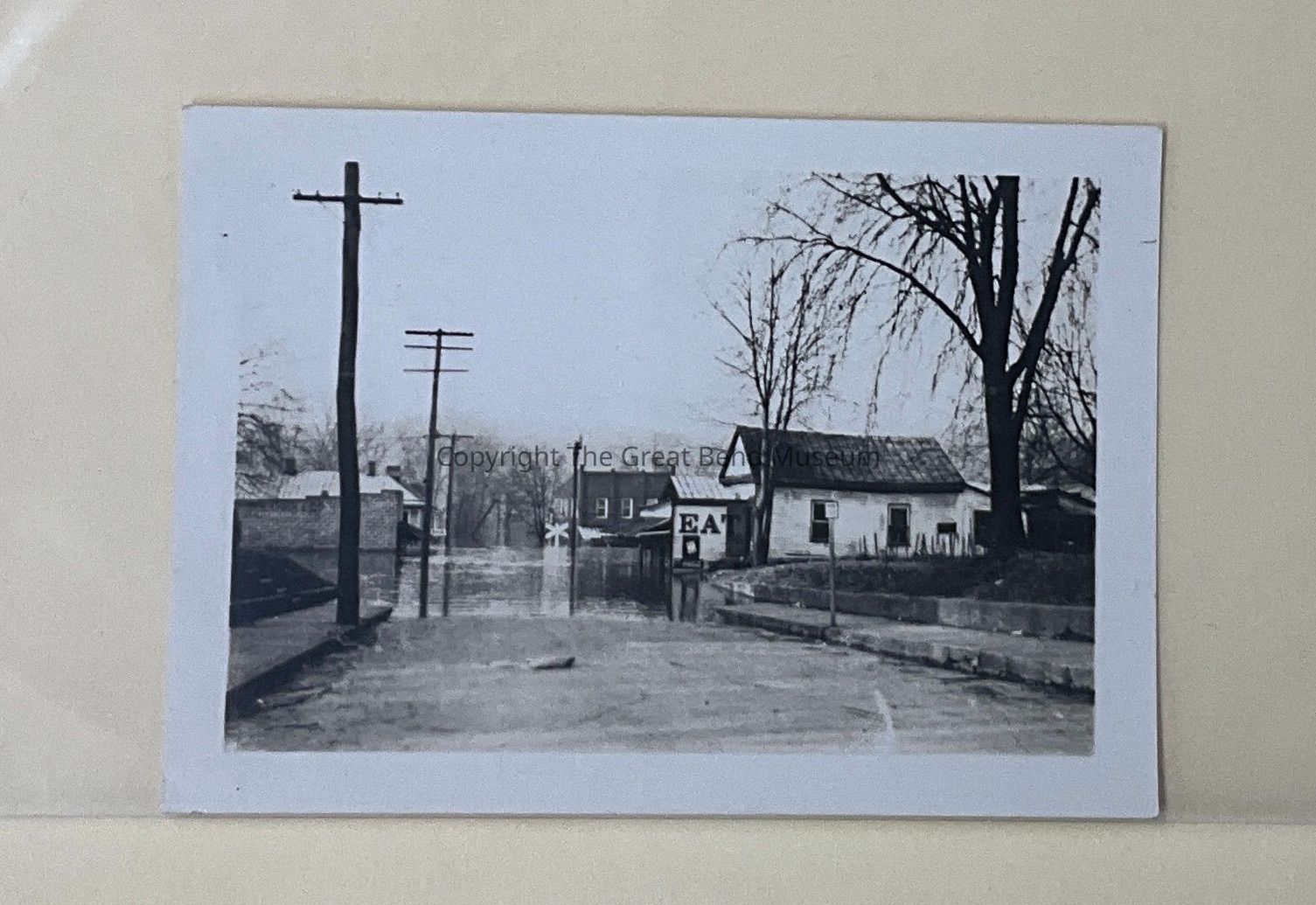 Photo of flood waters on Mulberry Street towards station. Water to the top of the railroad crossing sign in station. Utility poles on the left of photo. White building to the right. No leaves on trees.