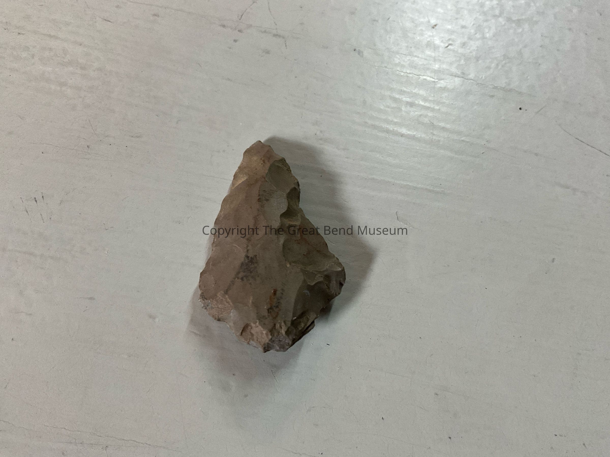 Gray Brown blade with rounded stem. Triangular in shape. Thickest in middle.shoulders are weak. Chip on one side of the basal edge. Somewhat serrated from resharpening.Acquisition