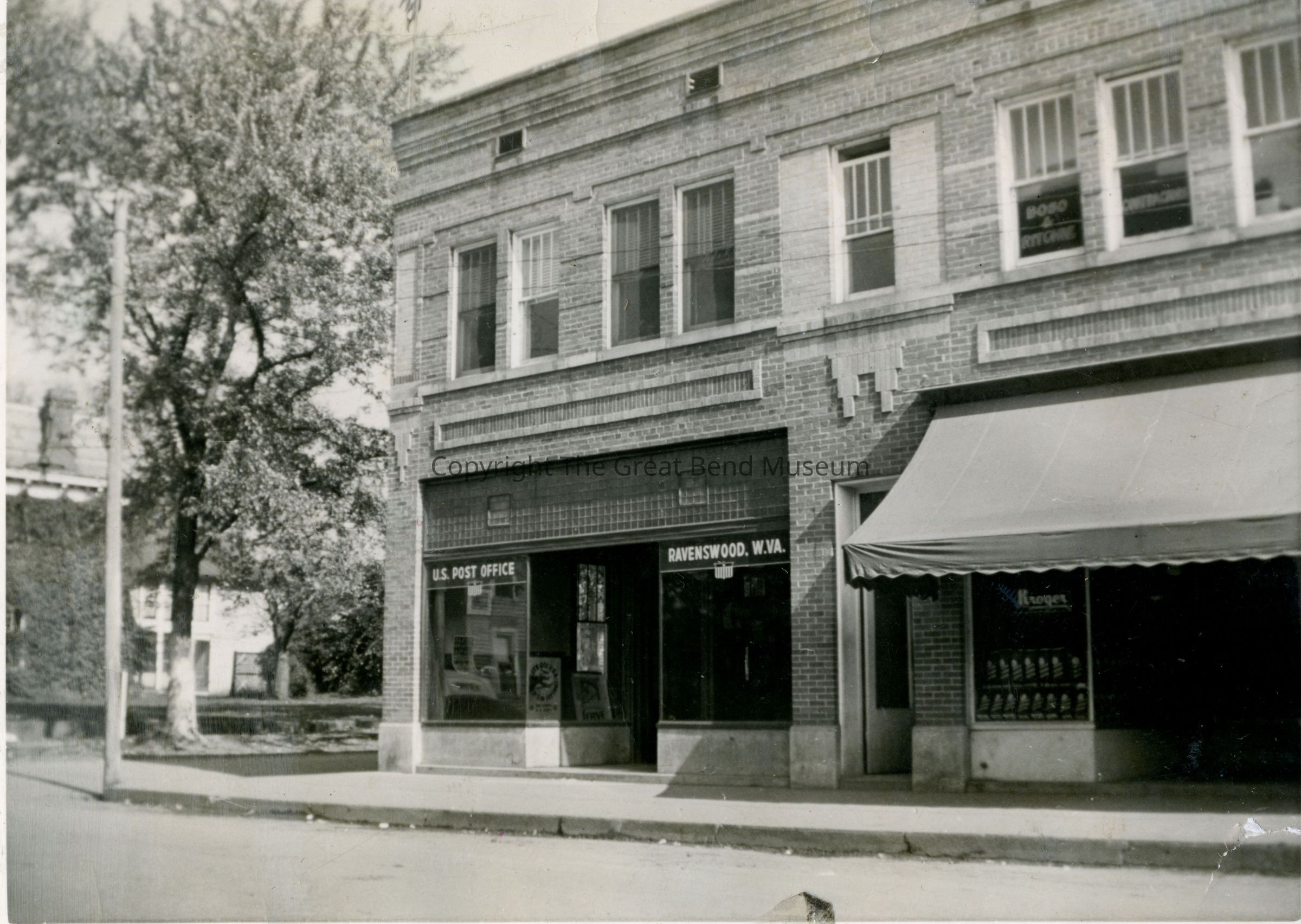 Photo of US Post Office - Ravenswood, W VA (it is on corner of Washington and Mulberry streets) 2-story building Next door is Krogers store with fabric awning. From Fast scrapbook, photo of 2 men on opposite side.Photograph Details