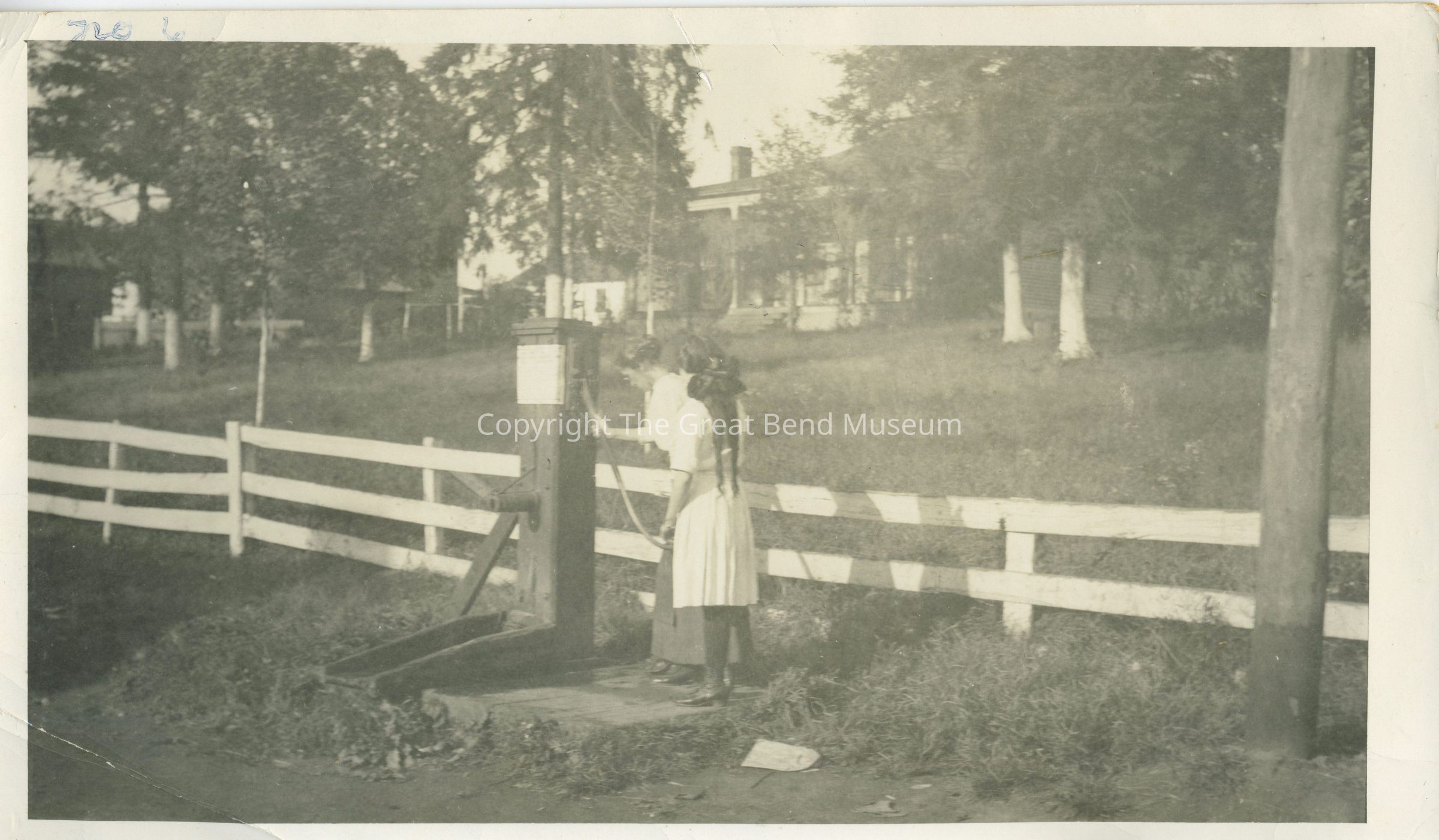 Image of a young girl and woman, possibly mother, at a pump. There is a white fence beyond with a tree filled yard in the distance. Just visible through the trees is a White House with columns and a chimney. On the back: " January 13th, 1863. I sold house to Mr. Robert Brown of Wirt County for $1100. I gave up the house with no regret, never expecting to live in it. It was a source of more trouble than profit. Henrietta F Barr."