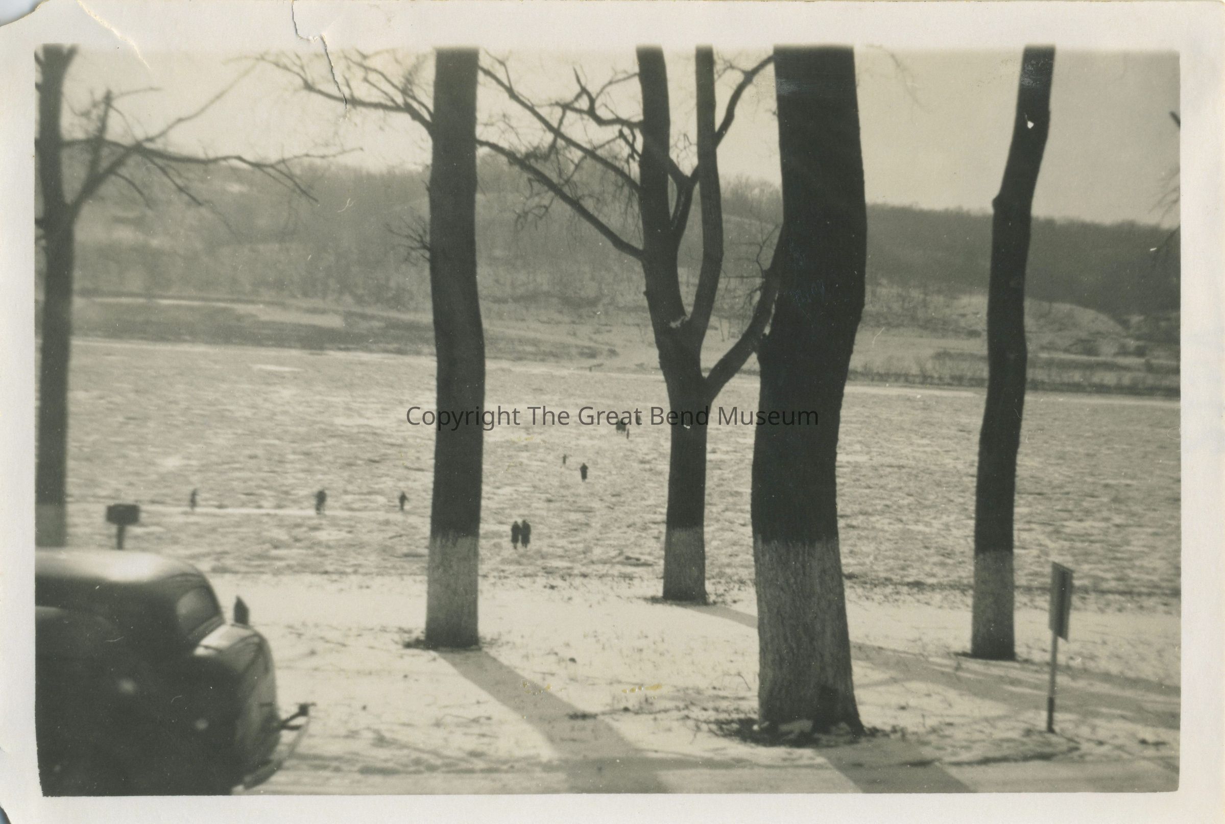Black and White photo -- Parked car at river - snow covers ground, people walking across frozen river. Street sign on right frame of photo. Back: "People walking across Ohio River 1940" stamped "215V"Acquisition