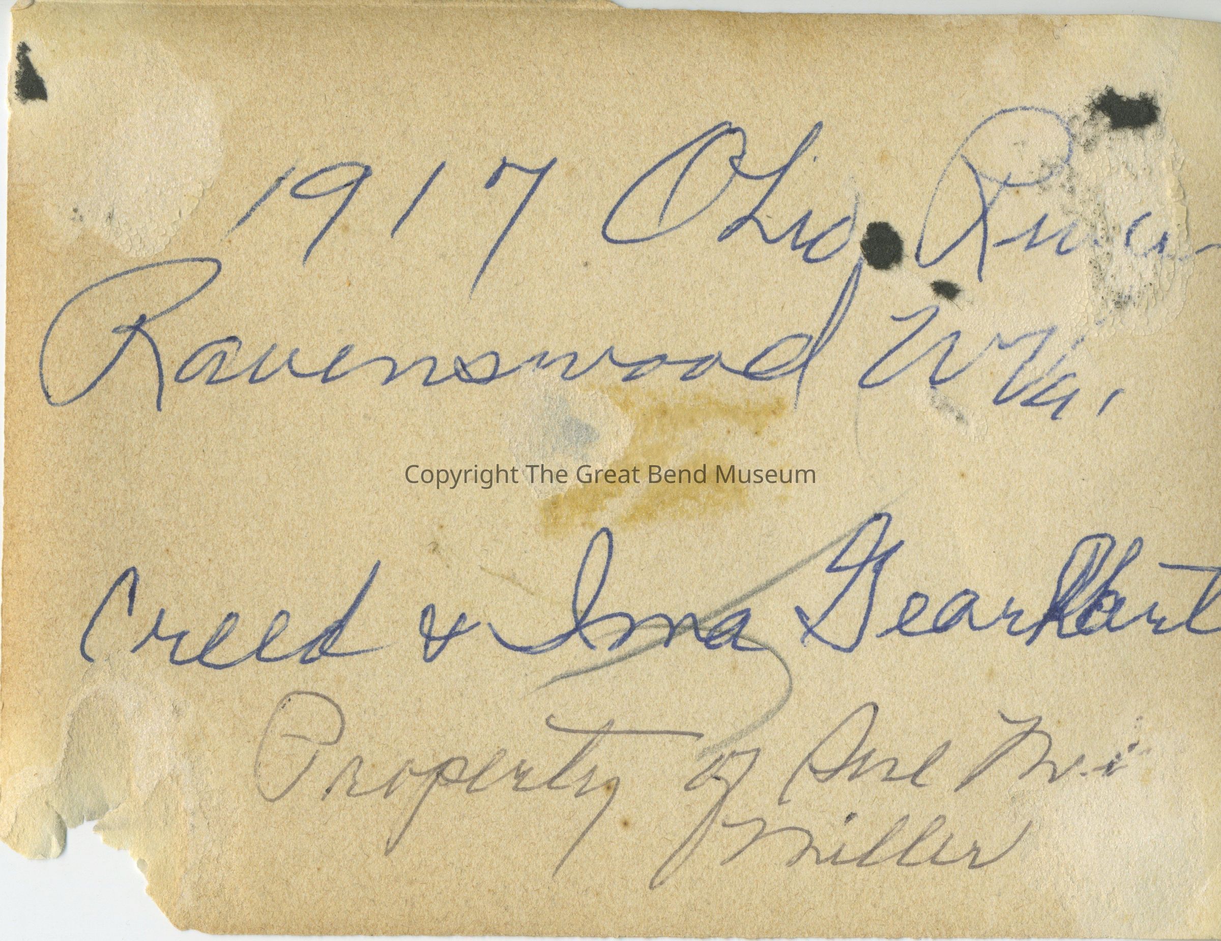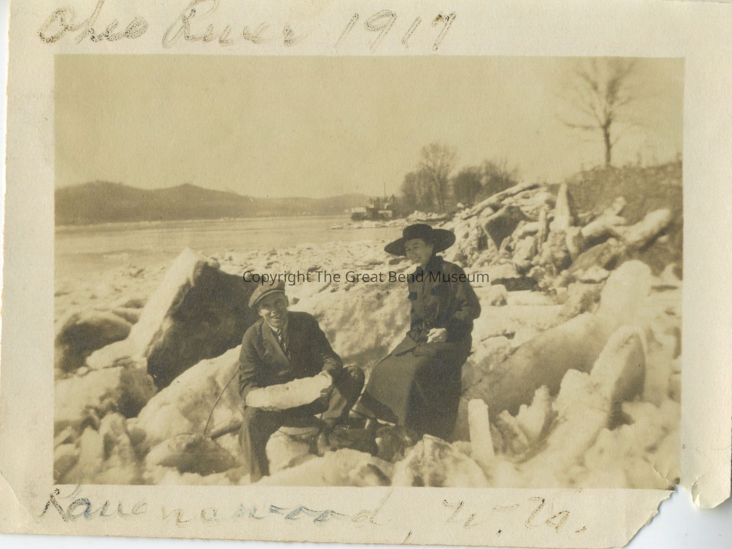 Portrait of Creed and Ima Gearhart(?) sitting among rocks on the banks of the Ohio River. Creed is grinning and holding a large chunk of ice. Ima sits beside him. The title is written above and below the image and on the back.Acquisition