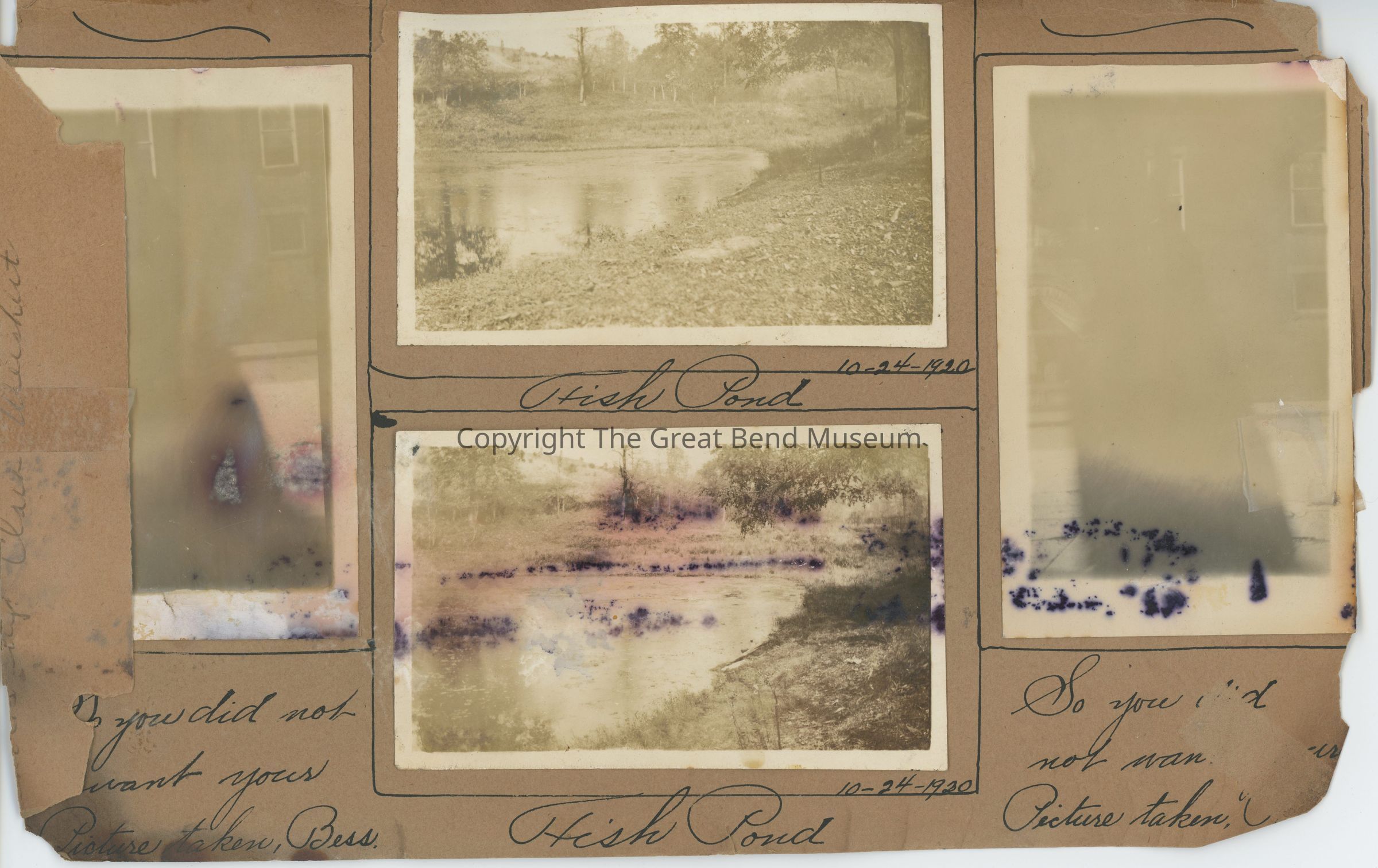 8 photos of Ravenswood in 1920. Town (from across river) creek, Ohio River, Fish Pond. Two blurry images captioned " so you did not want your picture taken, Bess" and ditto but name gone (appears to be same image).