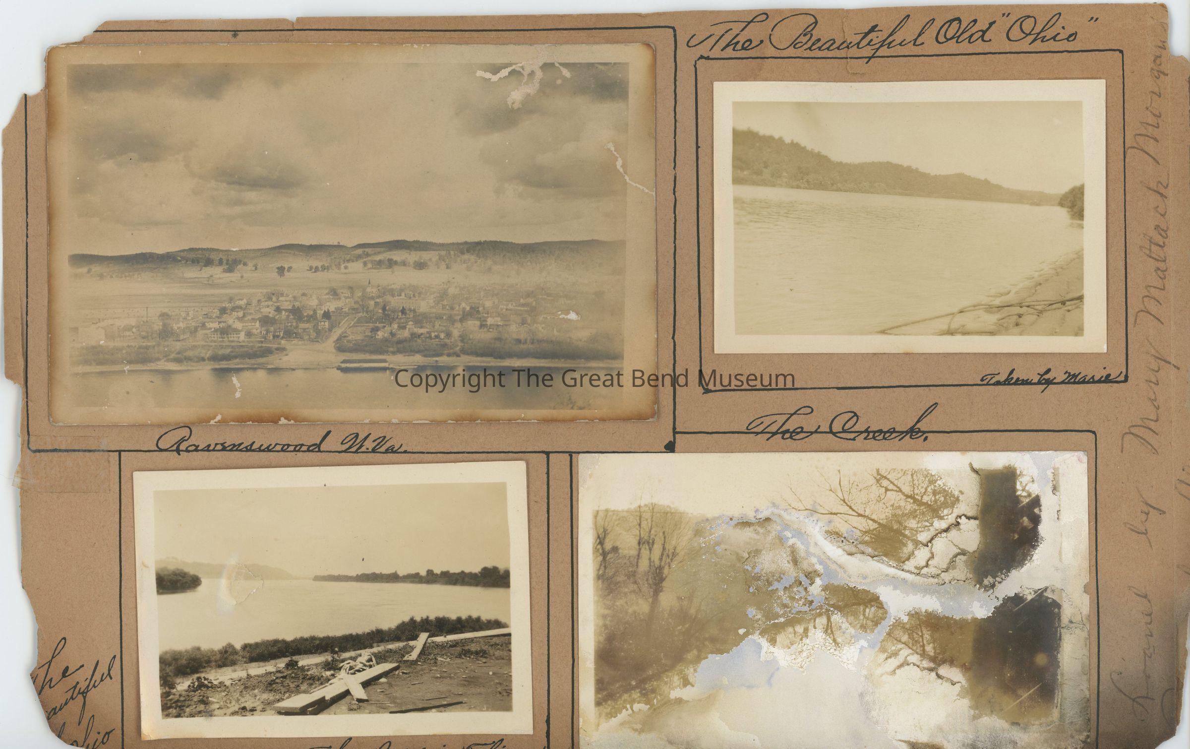 2 photos of Ohio River labeled "taken by Marie Flinn." One copy of Frank Cooper's 1903 aerial photo of Ravenswood from the hill on the Ohio side.Photograph Details