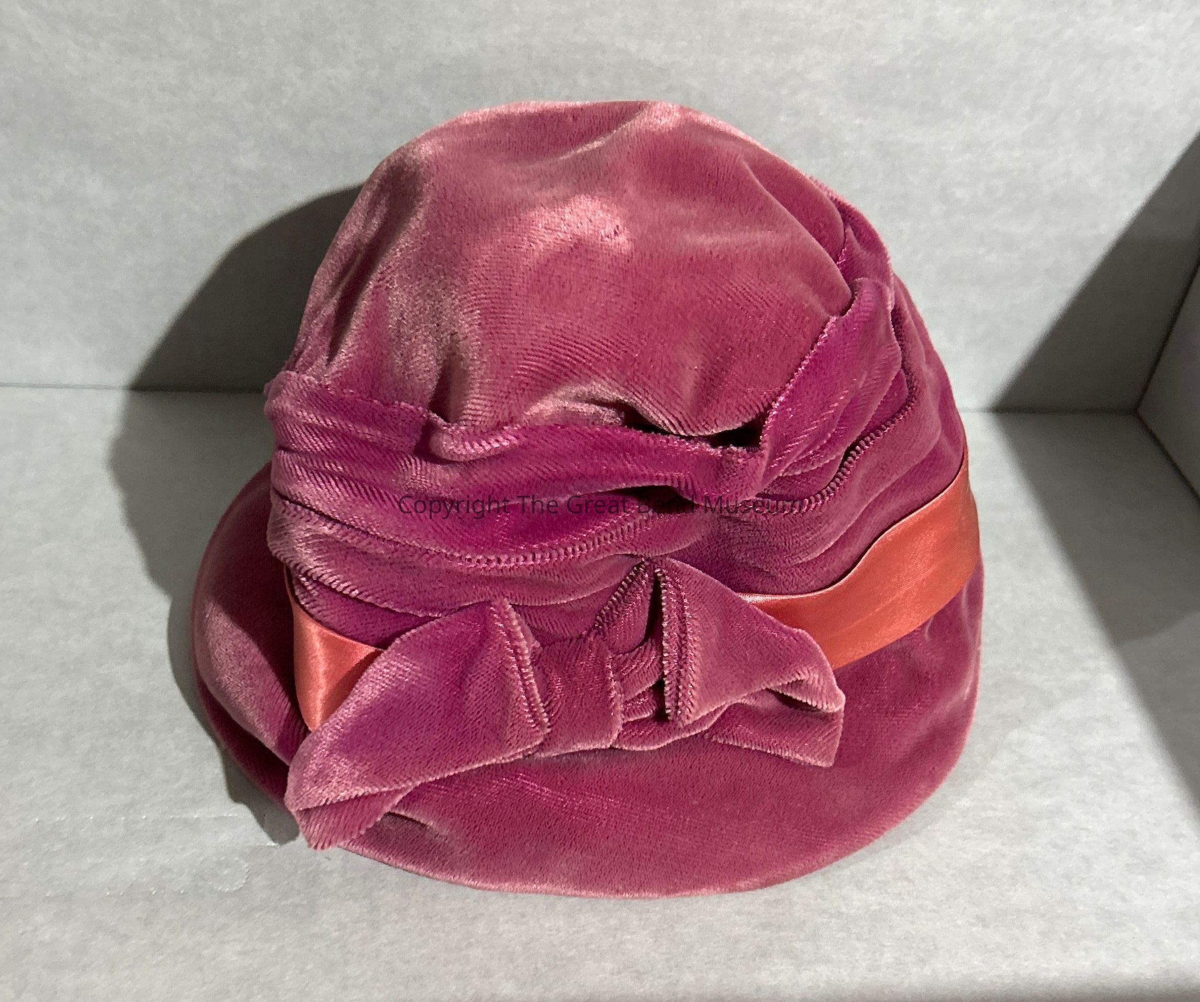 Dark pink hat with lighter pink ribbon and dark pink bow on the front. Manufacturers label #469310 "Union Made" United Hatters Cap + Millinery. Bell shape cloche hat with wire inside the brim.Clothing/Dress/Costume Details