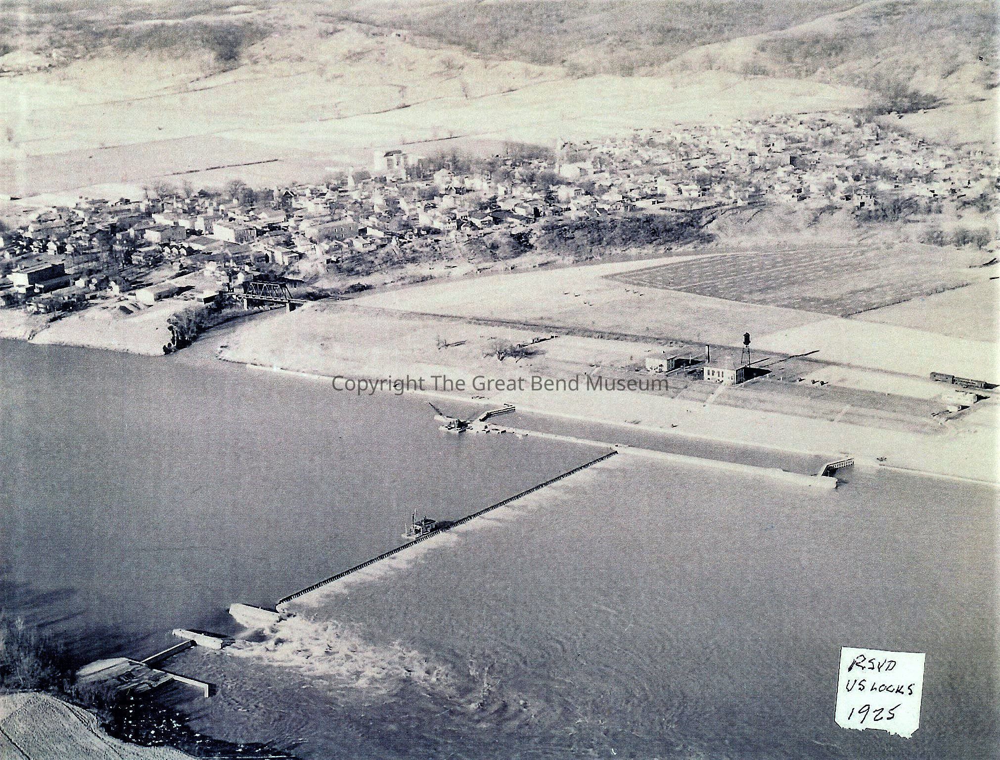 Aerial view of locks and dams system, Ravenswood is in the distance. Maneuver boat moving along wicket dam in the lower right corner: RSVD (RSYD?) US LOCKS 1925