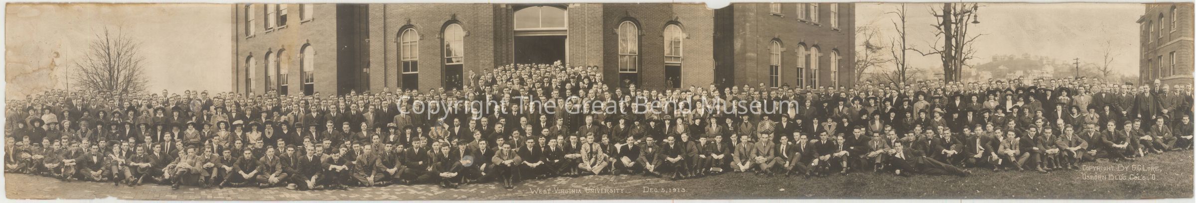 West Virginia University, Dec. 5 1913. Copyright by GC Lore, Osborne Building, Col's 0. Black wool frame - has some damage picture has some water damage.Acquisition