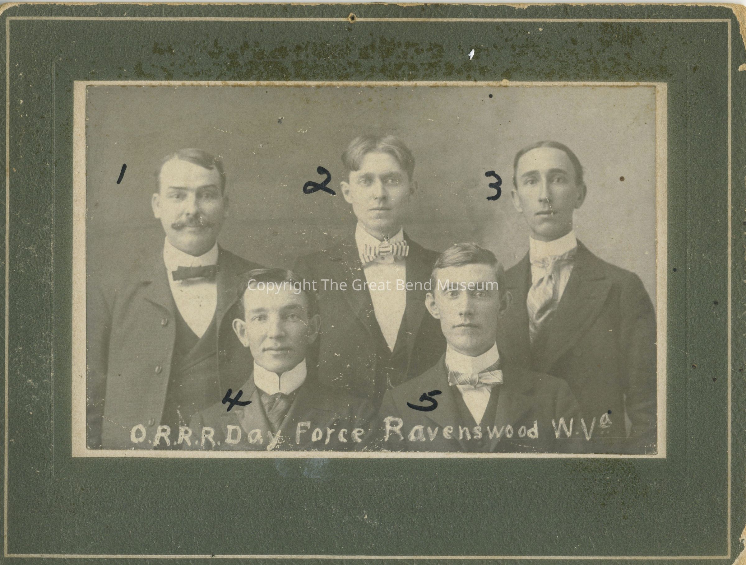 It is a portrait of five young men. Label and back identifies them as 2). Earl PVD Harpold, top center 4). Frank Fleming, Bottom left 5). John H. Neil, bottom right. Top right are unknown figures numbered in black ink. Photo is mounted on cardboard, title is etched into the bottom of the image.Photograph Details