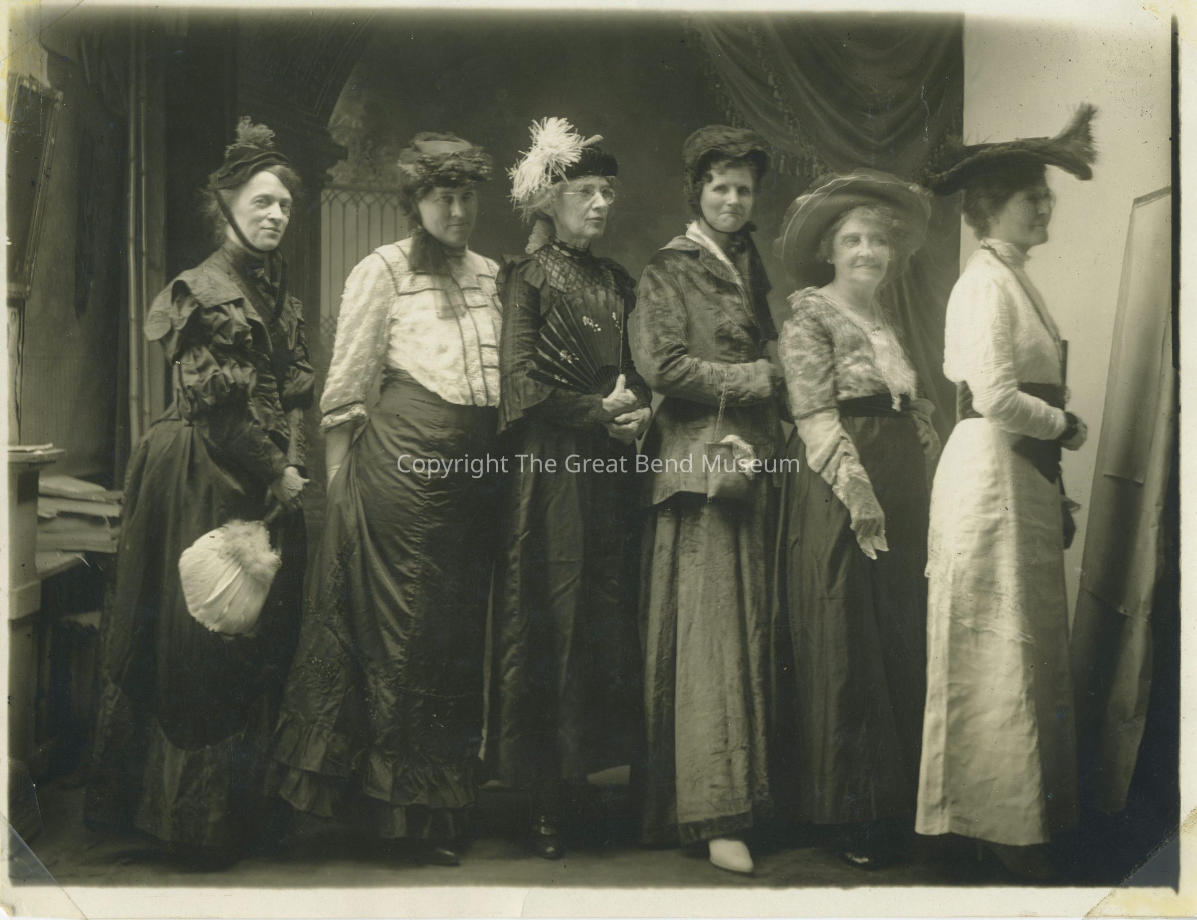 There are six women dressed in Edwardian clothing lined up in a heavily curtained room with a large window in back. The label identifies them left to right as: Mary Adams Ginther Spawn, Marie Brown (Mr. Edward Brown), Jessie Fleming Polsene, Cora Hutchinson Cole, Jessie Geren, Mary Vosburgh PitthanPhotograph Details
