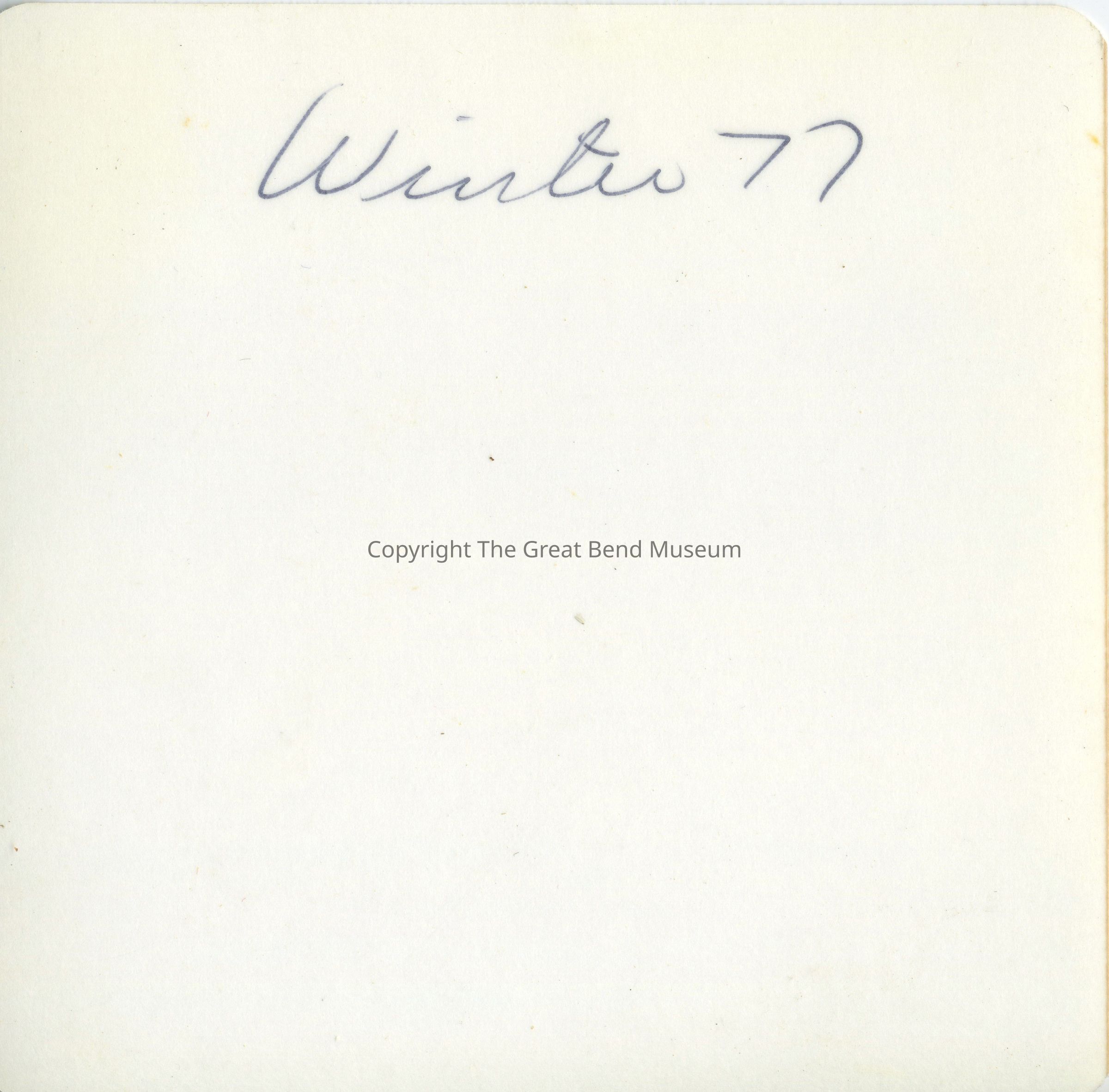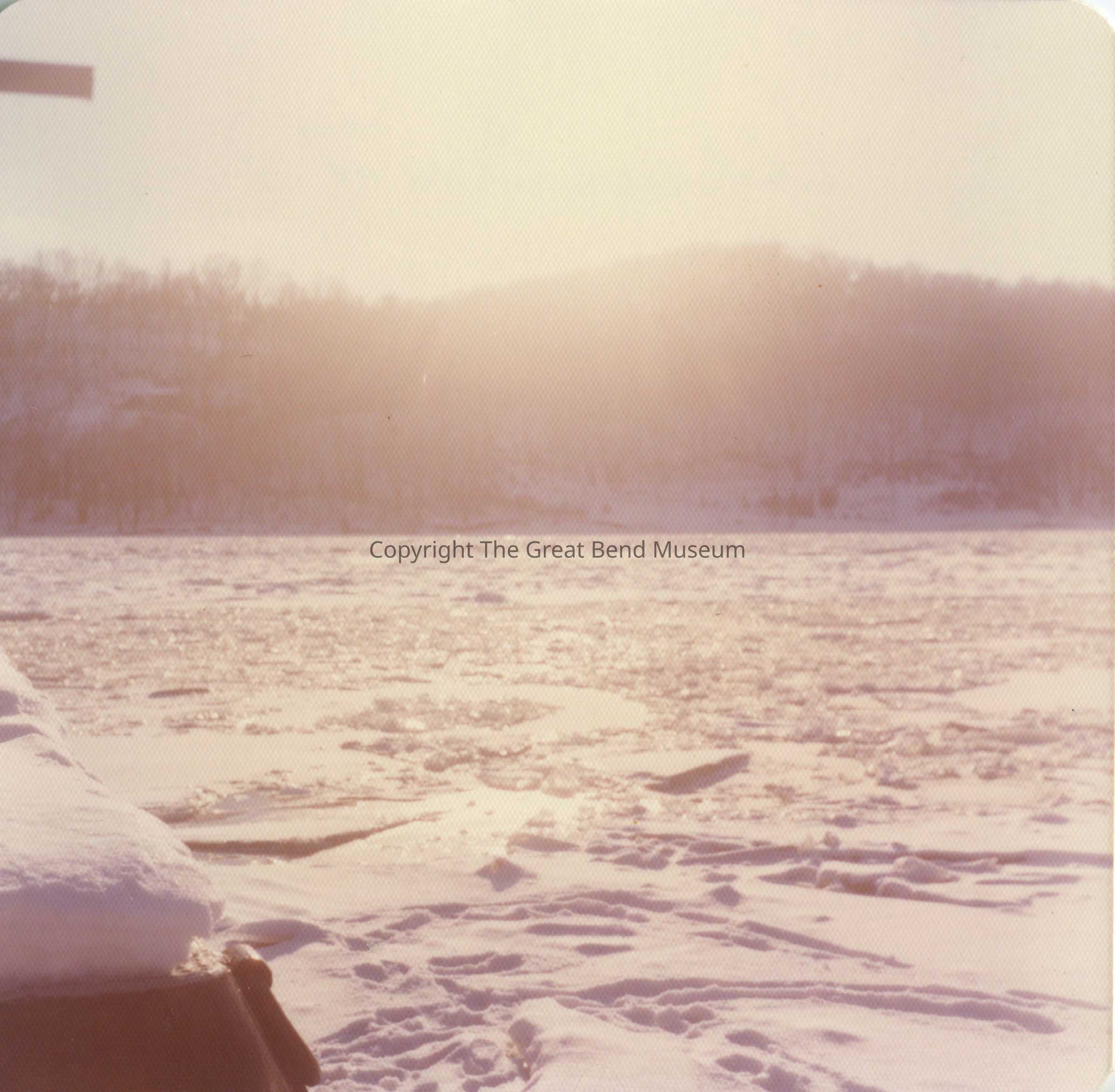 #1 Photo -------- Color photo (faded) sun across Ohio River frozen - chunks - view across river - upper left black "bar" at edge of photo, Back -- "Winter 77"Acquisition