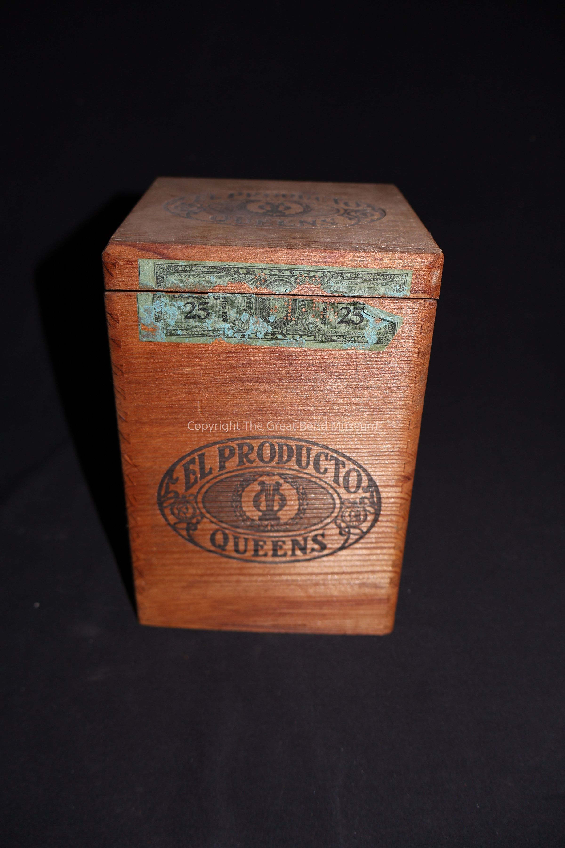 inside lid picture of a woman with 25¢ price tag. front of box burned with logo of El Producto Queens. seal light blue that says cigars 25 united states. bottom of box burned with notice about refilling box at Factory #2.Acquisition