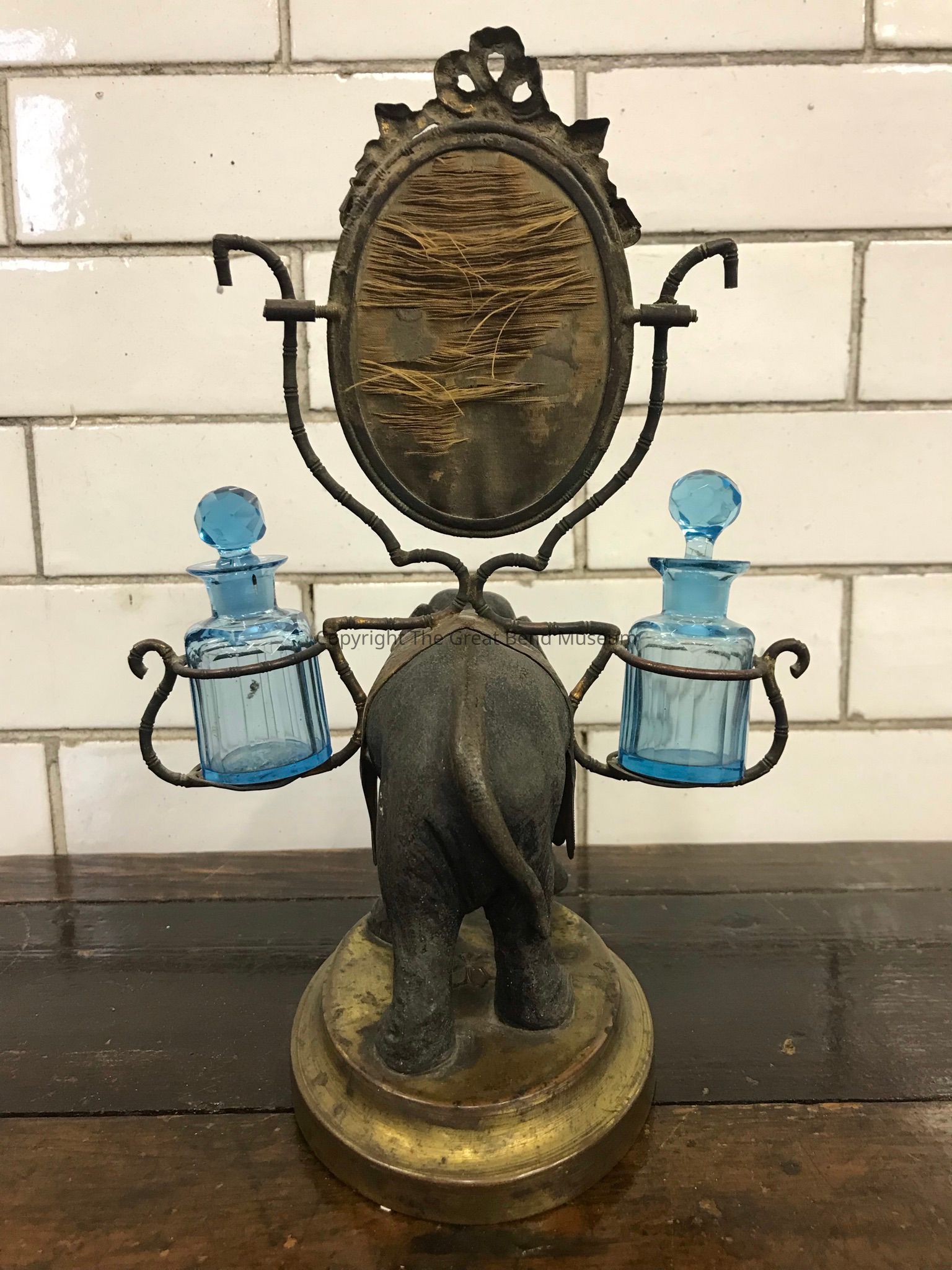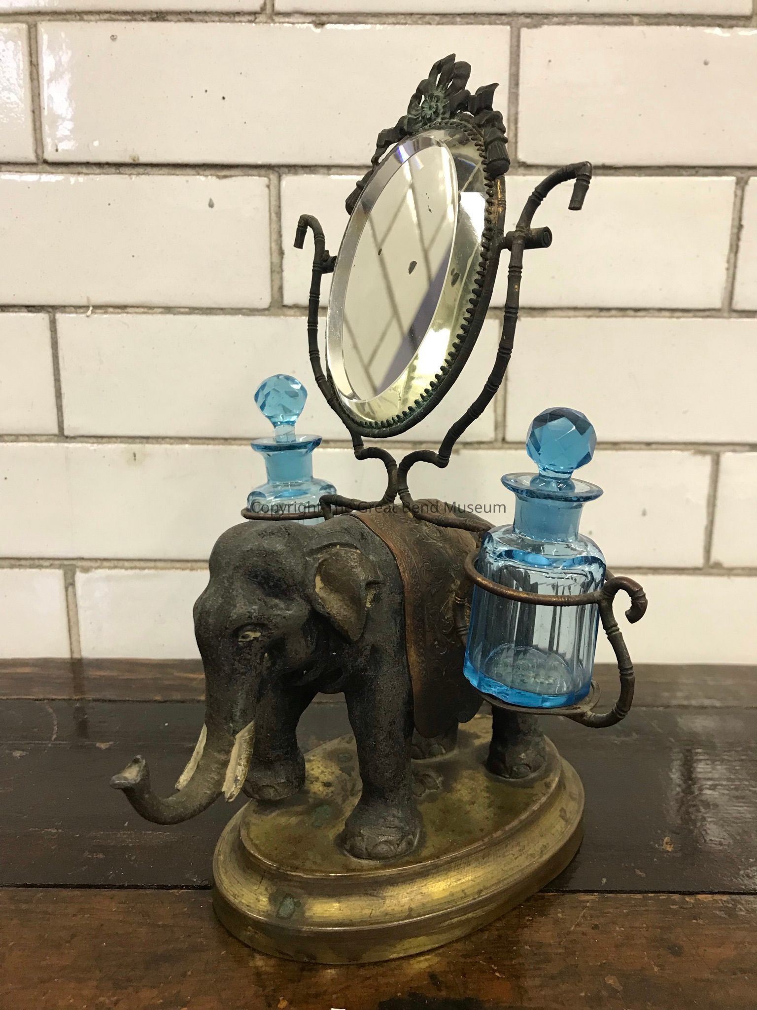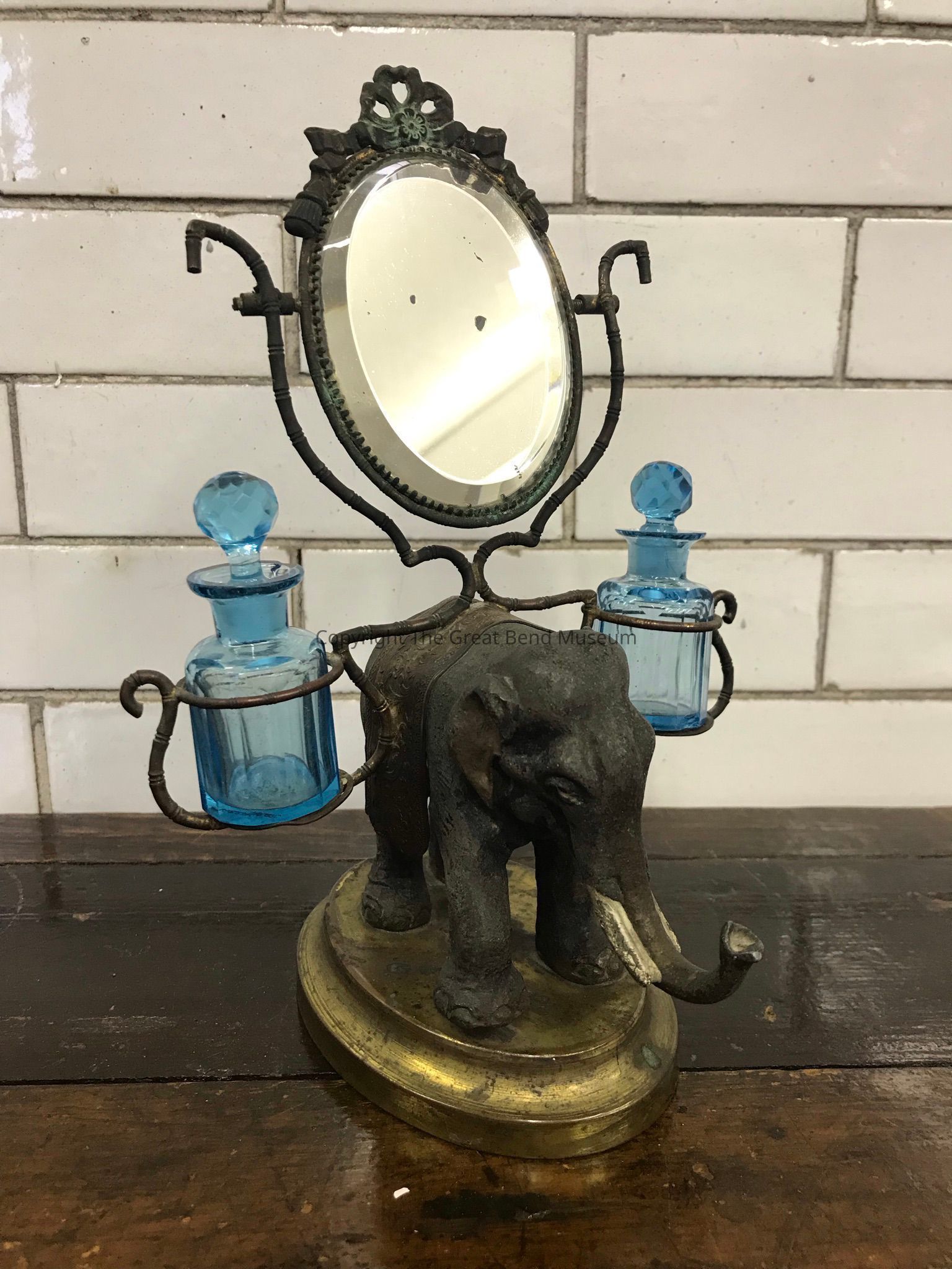 It has a mirror and two perfume bottles. The bottles held in French ormolu design. The "Fancies" rest on a cast iron elephant that stands on a brass plated base. The perfume bottles are "electric blue" and the bottle design is cut glass with cut stoppers with a beveled mirror. It was a gift for the 50th wedding anniversary of Barthalemew and Hannah (Warth) Fleming by Henry and Henrietta Fitzhugh.