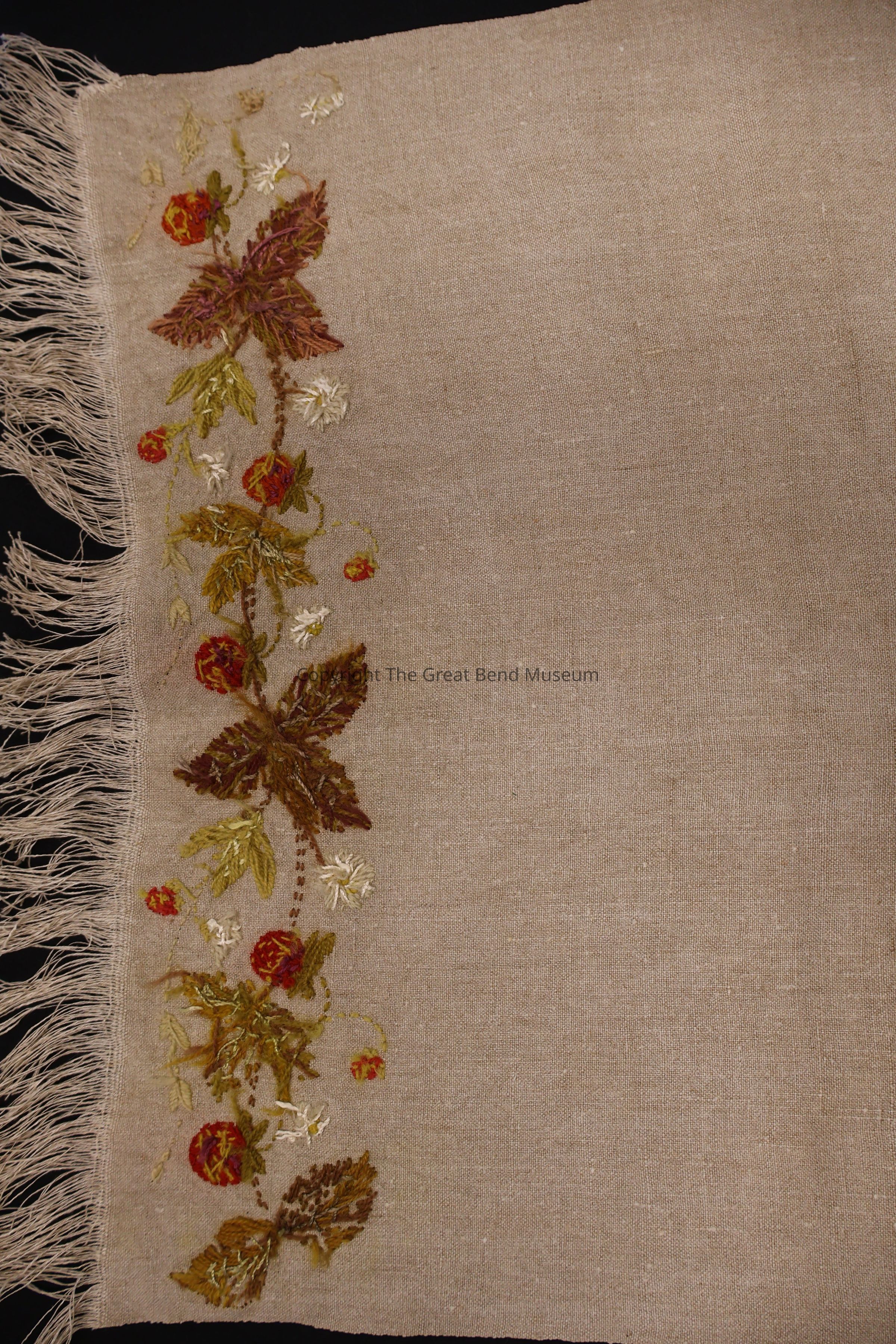 Tan linen scarf with multi colored embroidery of white daises and red strawberries with green leaves, has fringed borders. One reference identifies it as tassel scarf.